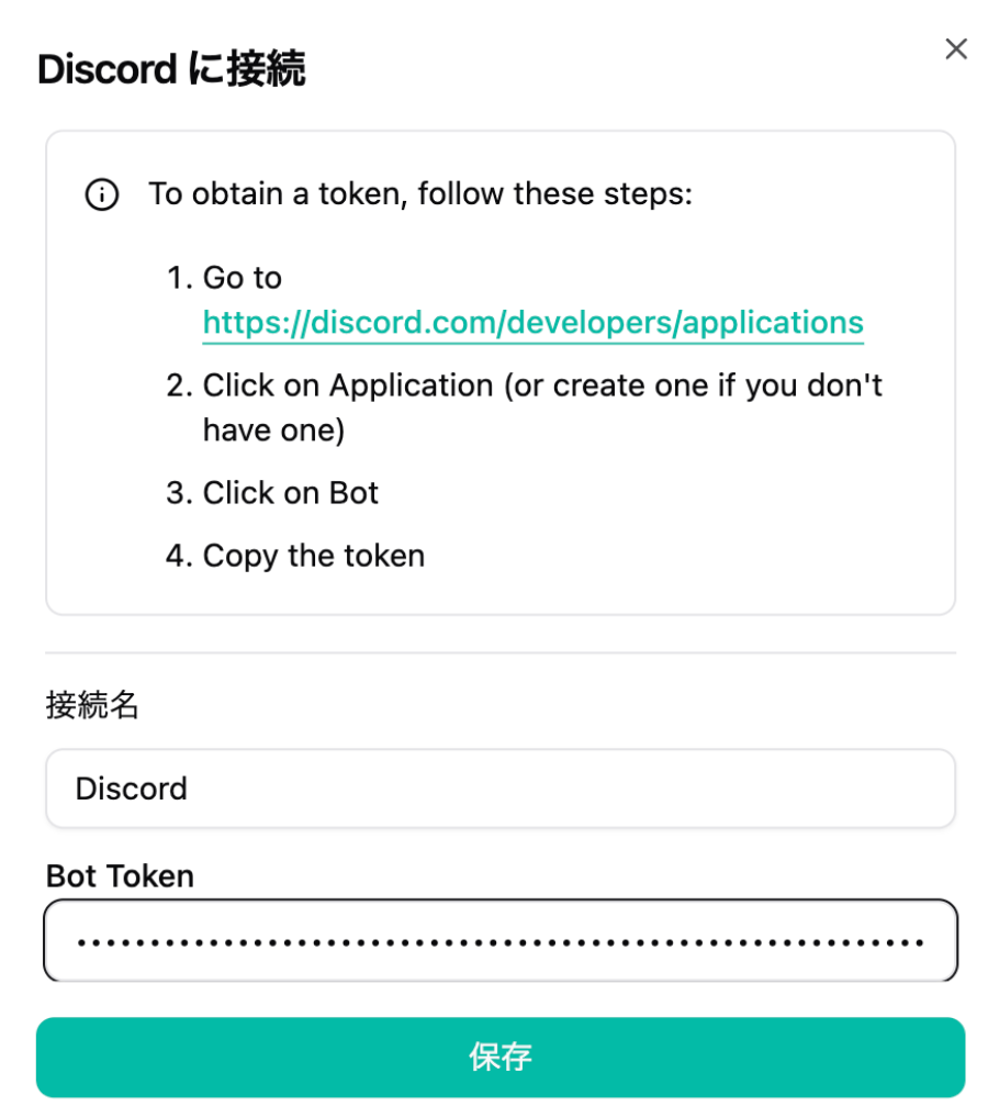 このピースでできることDiscordの接続方法1. 接続を作成2. Discordアプリの作成3. Botのインストール4. Bot Tokenを取得する。5. 「保存」を押して接続名が設定されていることを確認する。ピースの設定項目1. サーバー(必須)2. チャンネル名(必須)