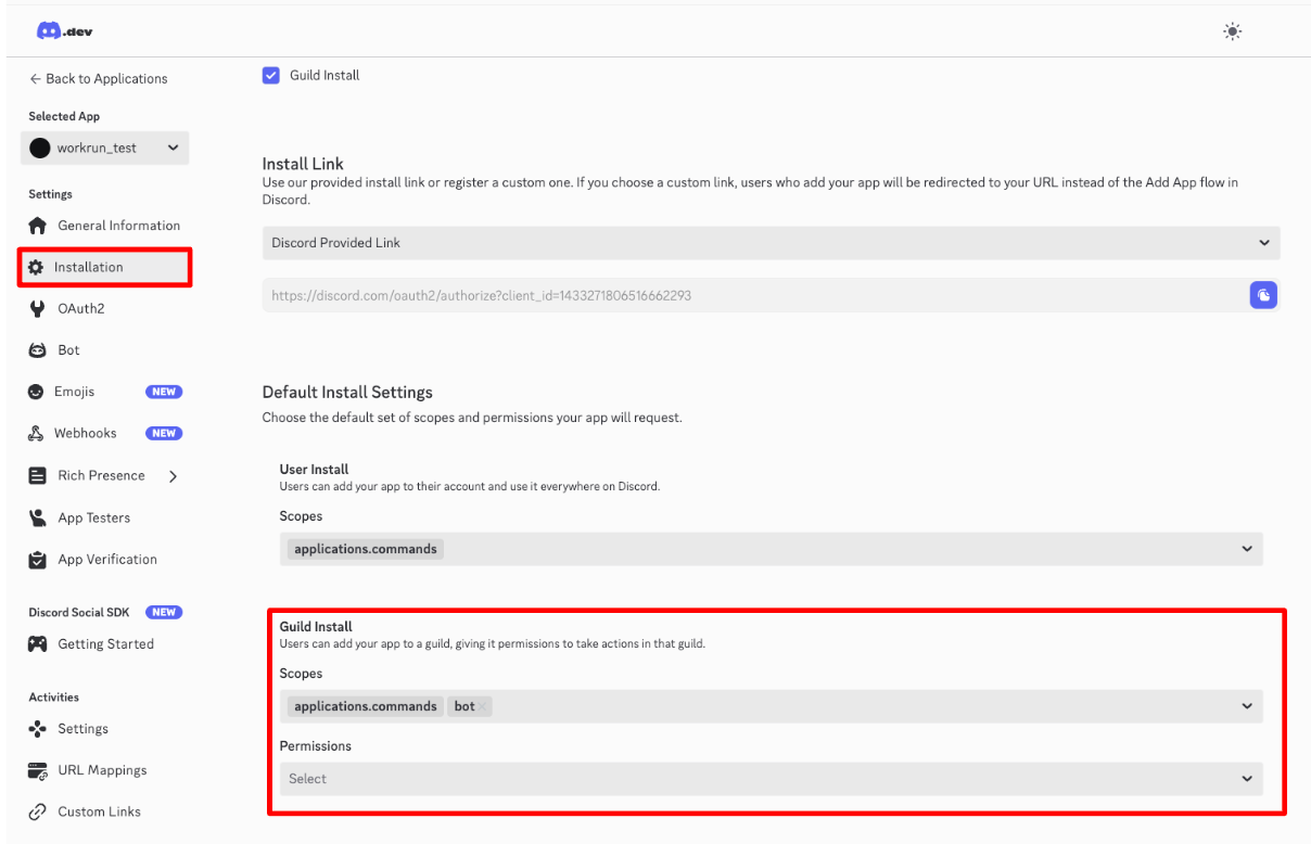 - サイドバーの「Installation」からBotインストール時のスコープ設定を行います。botをインストールする方法については公式ドキュメントを参考にしてください。一例としてギルドインストール時にパーミッションを設定する場合には赤枠の部分で設定を行います。