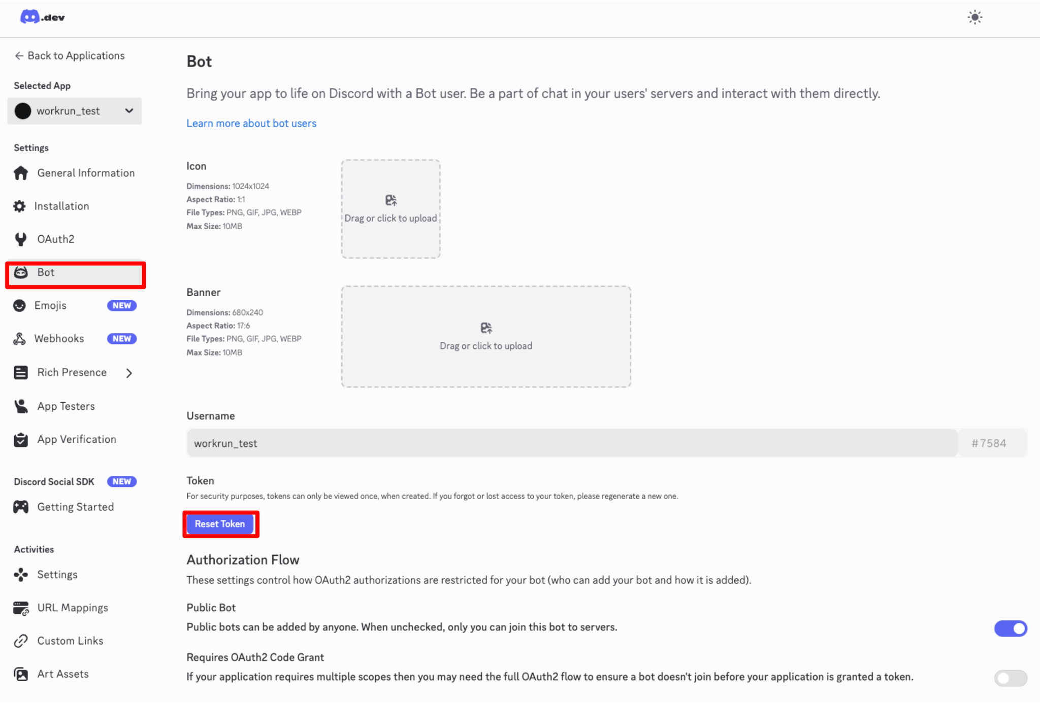 - サイドバーの「Bot」からBot設定画面に入り「Reset Token」を押してトークンを取得します。トークンは一度しか表示されないので必ずどこかにメモをしてください。