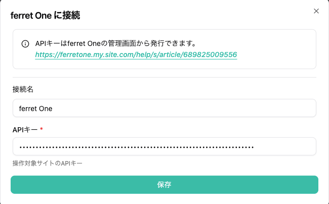 workrunのferret Oneピースの接続でAPI keyを貼り付ける。
