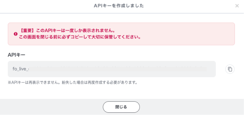 API keyが表示されるのでメモします。二度と表示されないのでメモを忘れないようにしてください。