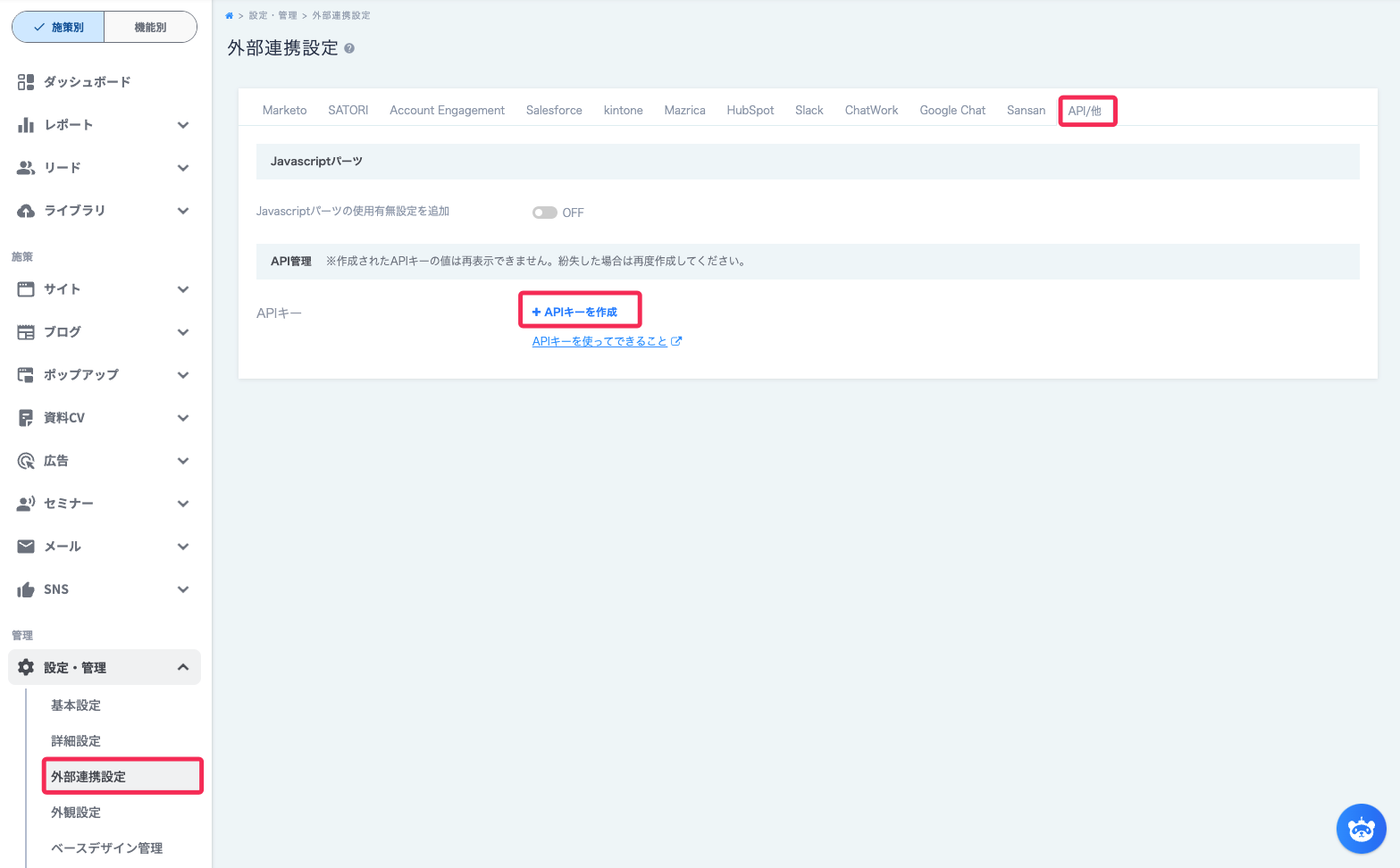 ferret OneのAPI管理画面のサイドバーから 設定・管理>外部連携設定>API/他 を選択する。画面真ん中の「APIキーを作成」をクリックします。