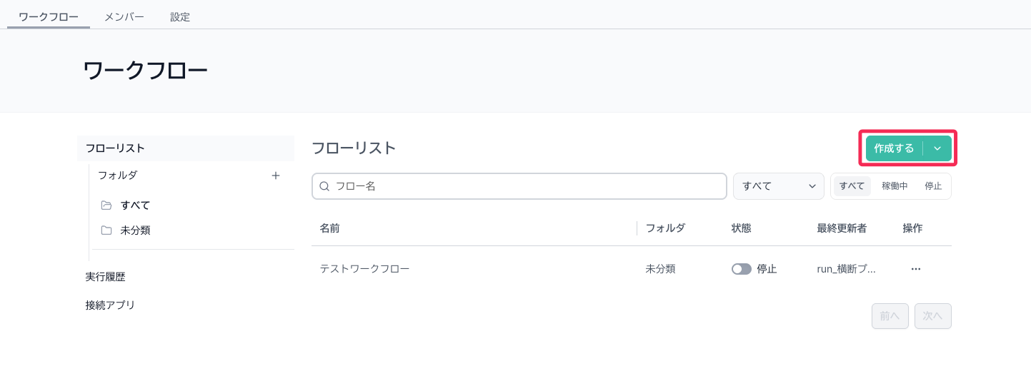- 右上の「作成する」からワークフロー作成編集画面を開きます。