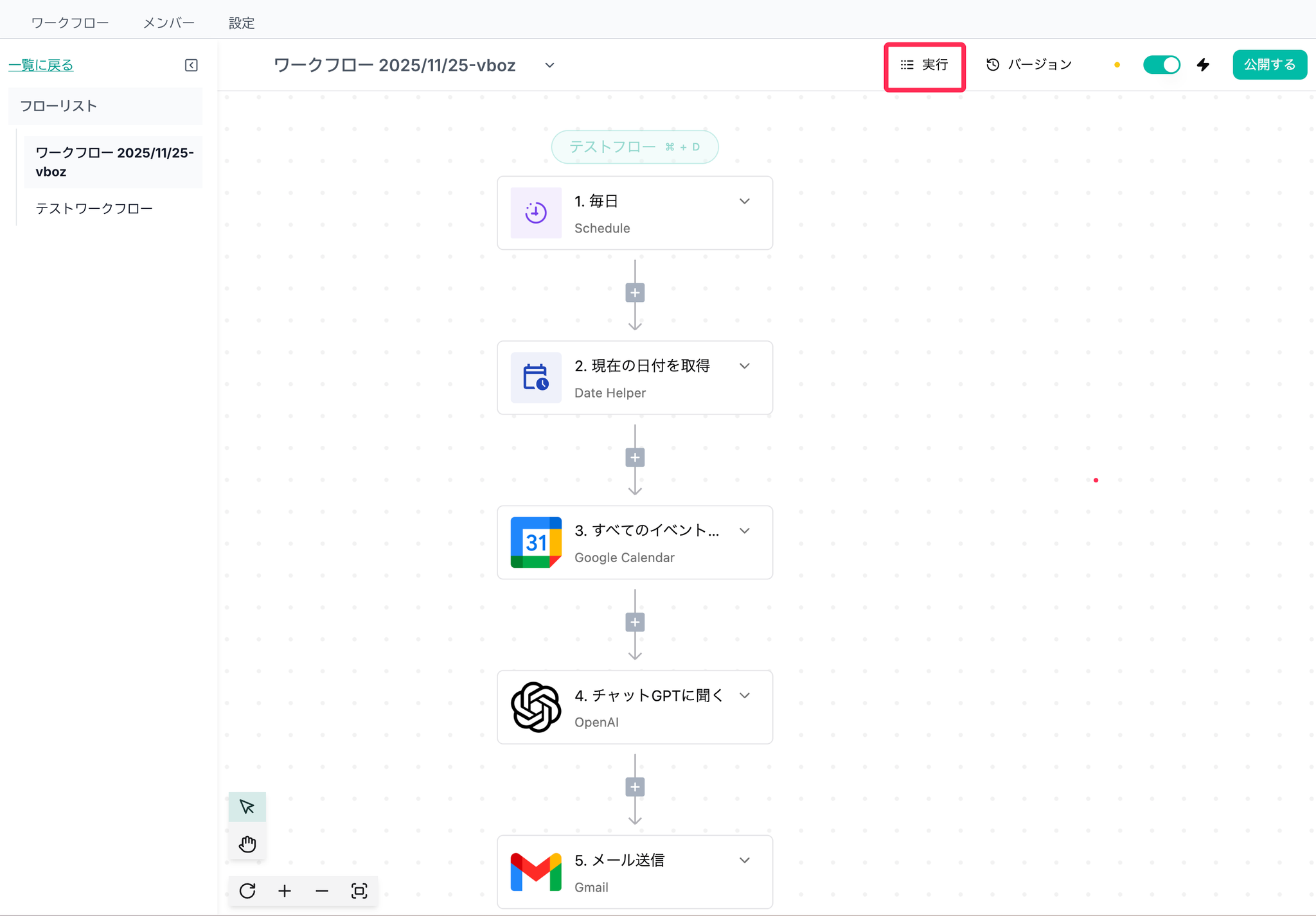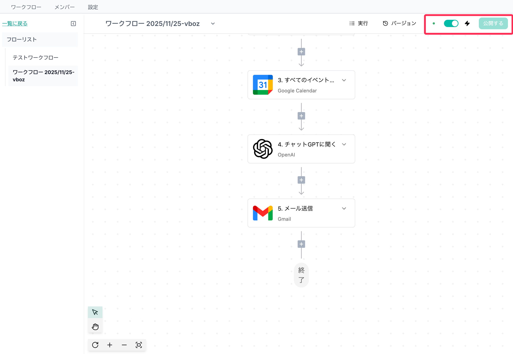 - 右上の「公開する」ボタンからワークフローを公開し、「公開する」ボタンの左のトグルがONになっていることを確認します。
