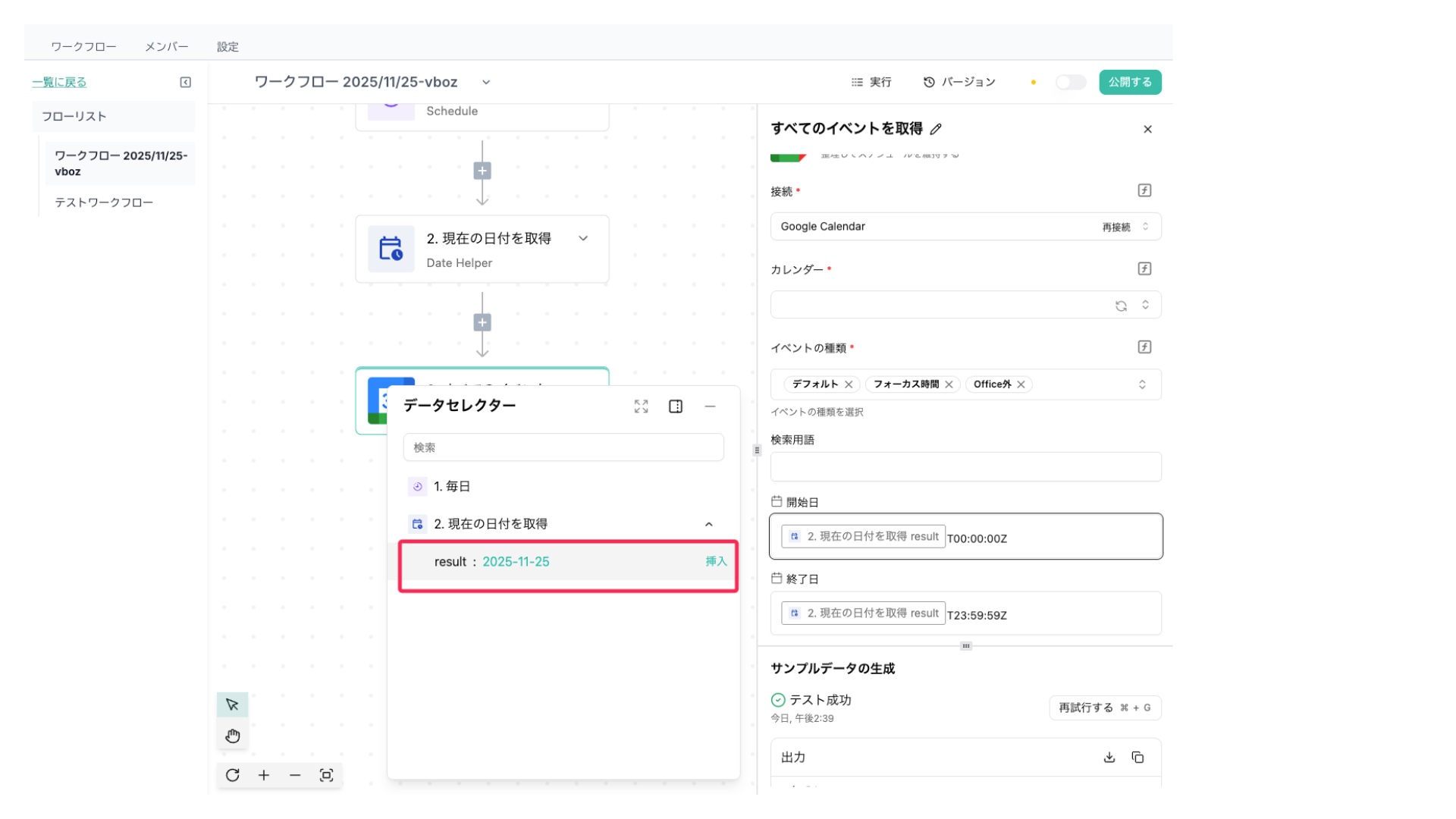 - 「開始日」と「終了日」にカーソルを合わせると真ん中に「データセレクター」というウィンドウが現れます。該当のピースよりも前のピースで生成したデータを使うにはこちらのデータセレクターから使うデータを選んで「挿入」を押します。今回は「現在の日付を取得」のピースで得られた日付を使いたいので下記の画像のデータ(result)を選んで挿入を押します。また、取得した日付の0:00~23:59までの予定を取得したいので時刻も直接入力します。