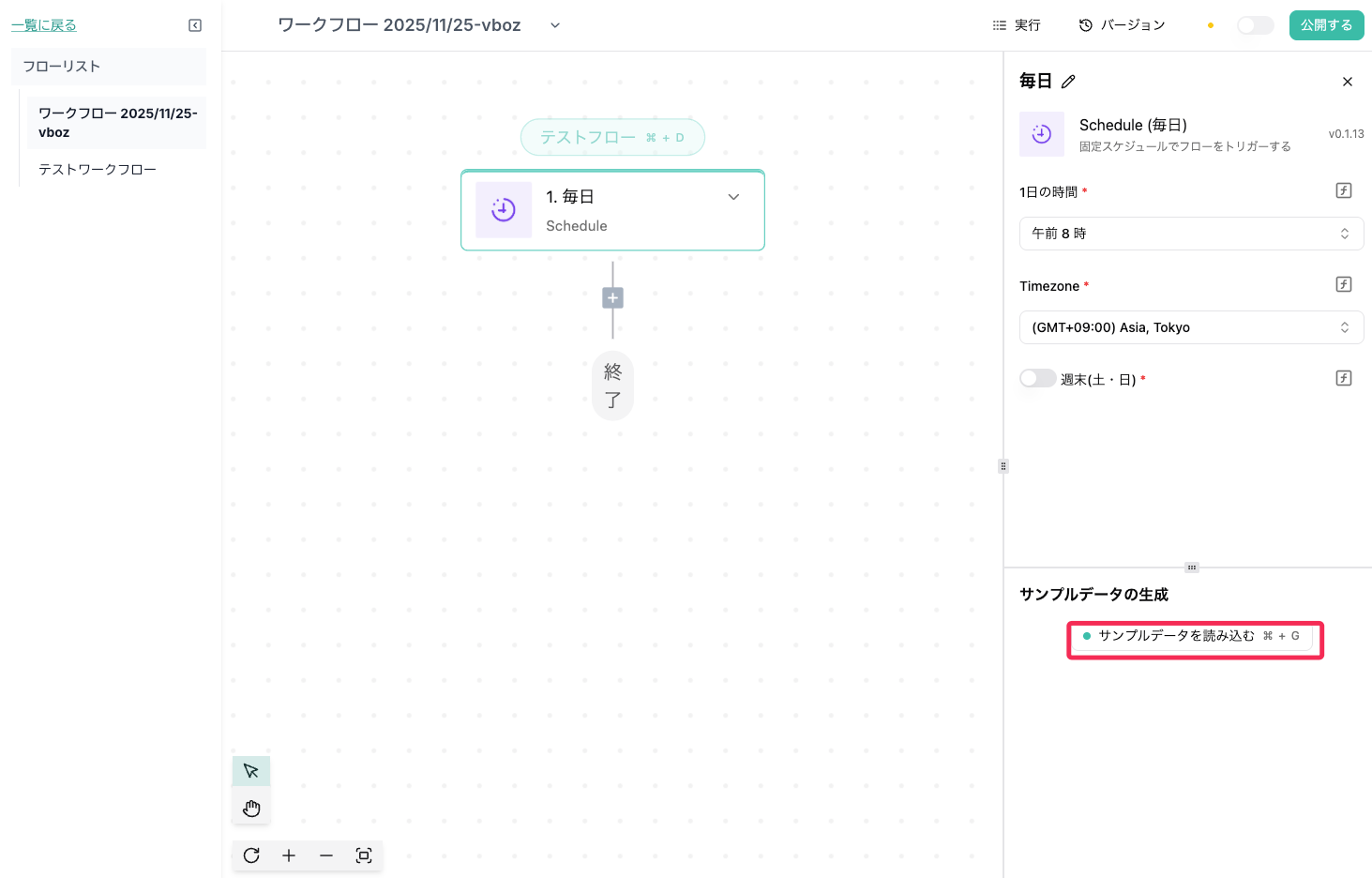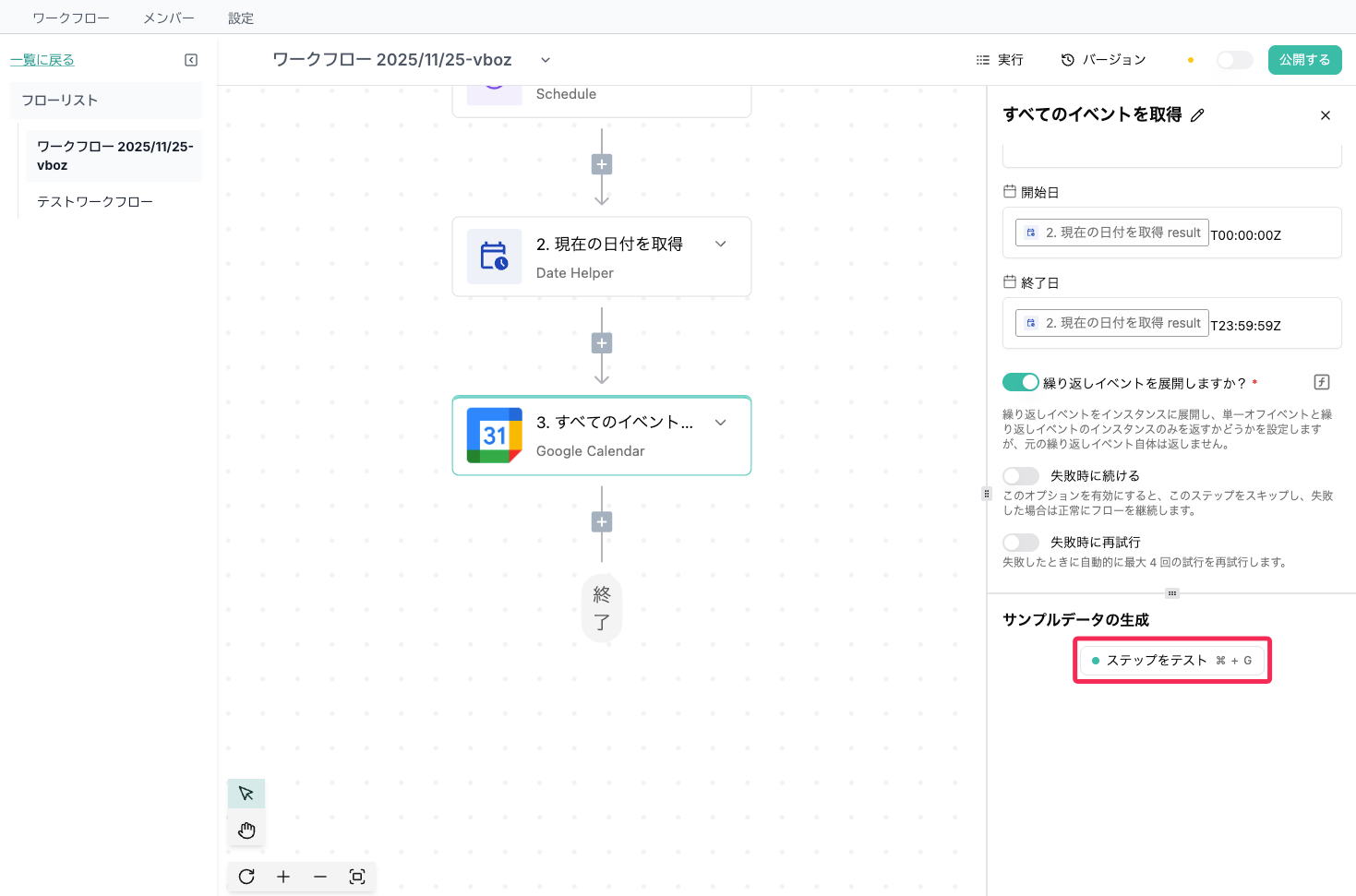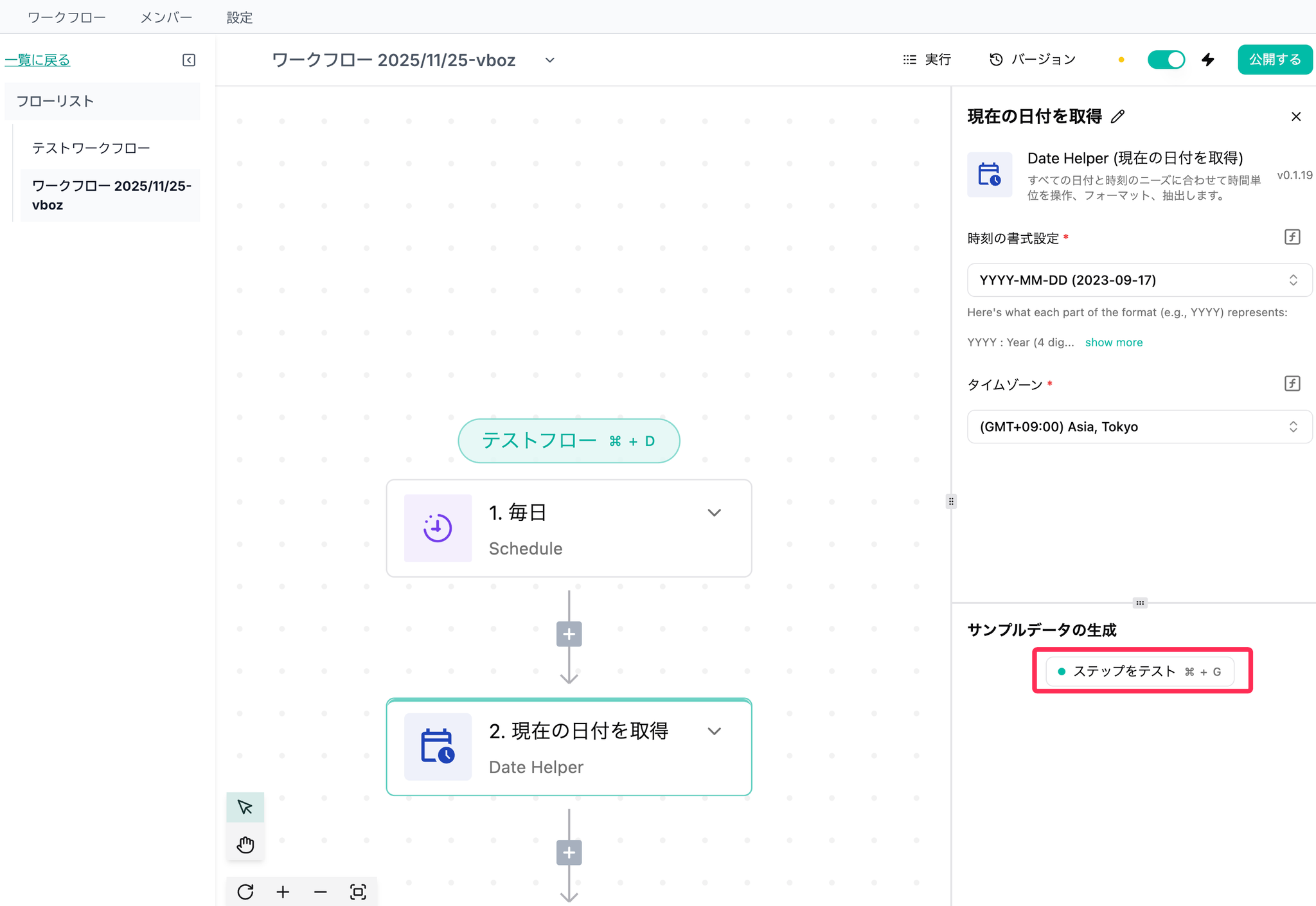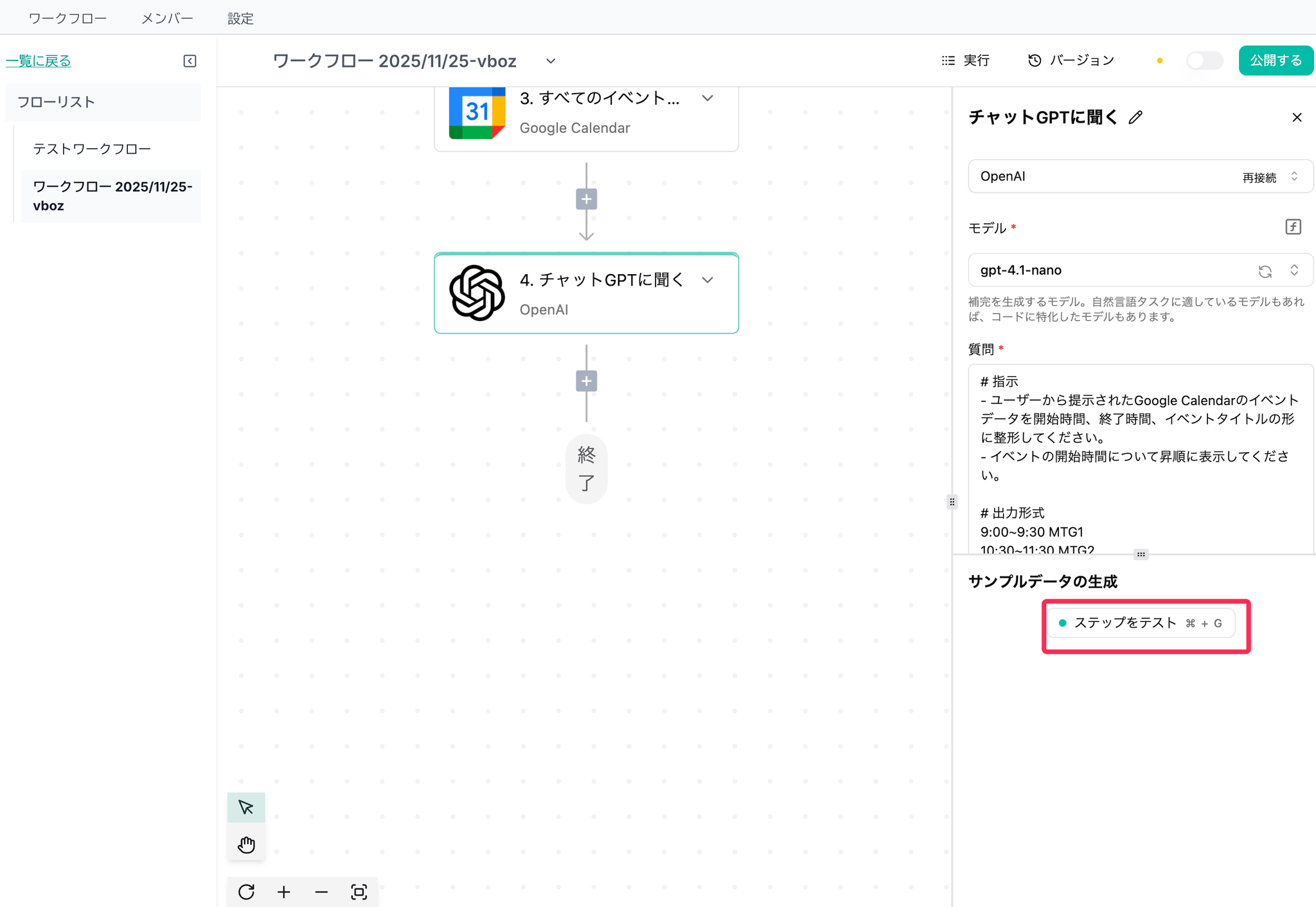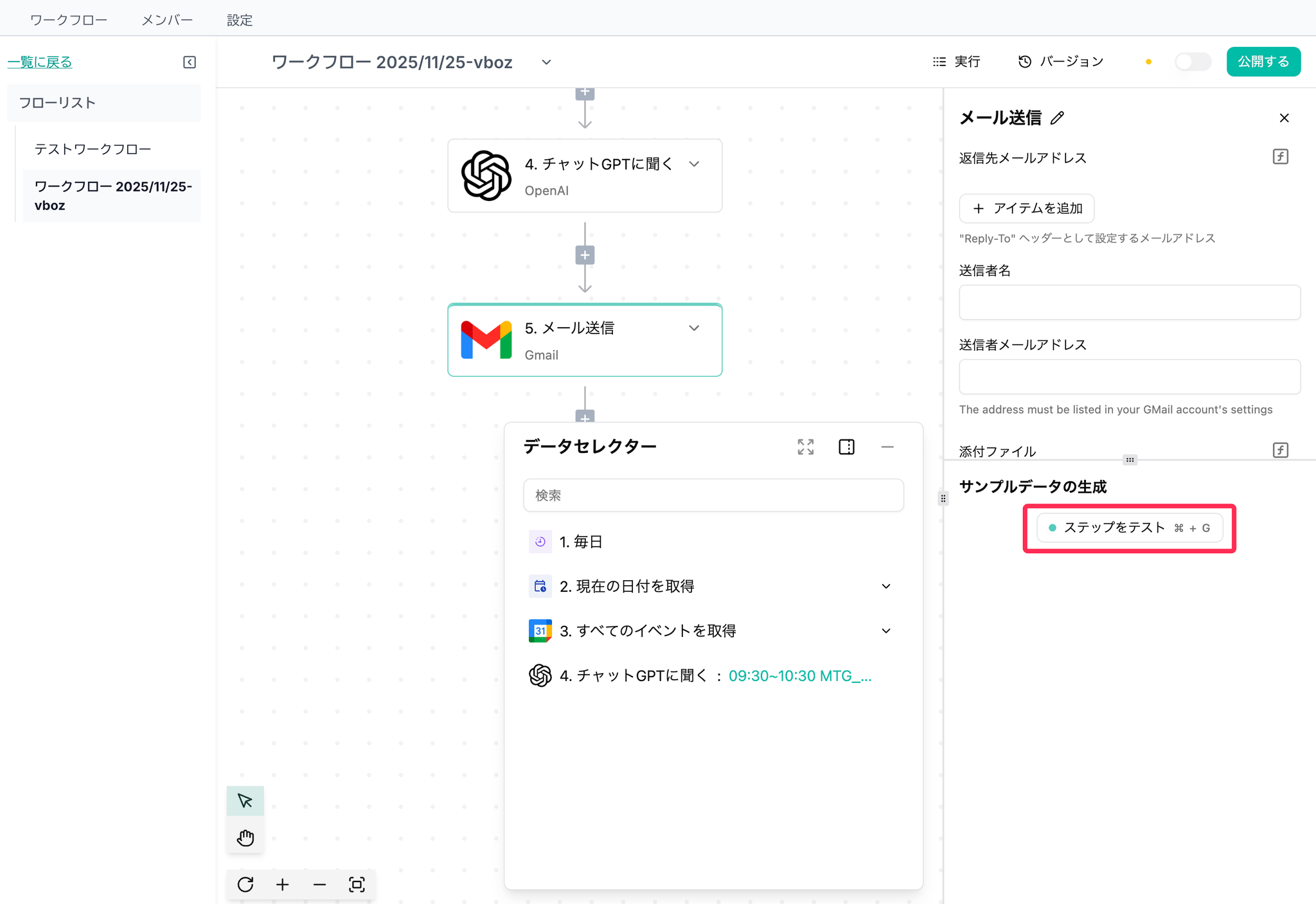 - 右サイドバーのサンプルデータの生成から「ステップをテスト」ボタンを押します。
