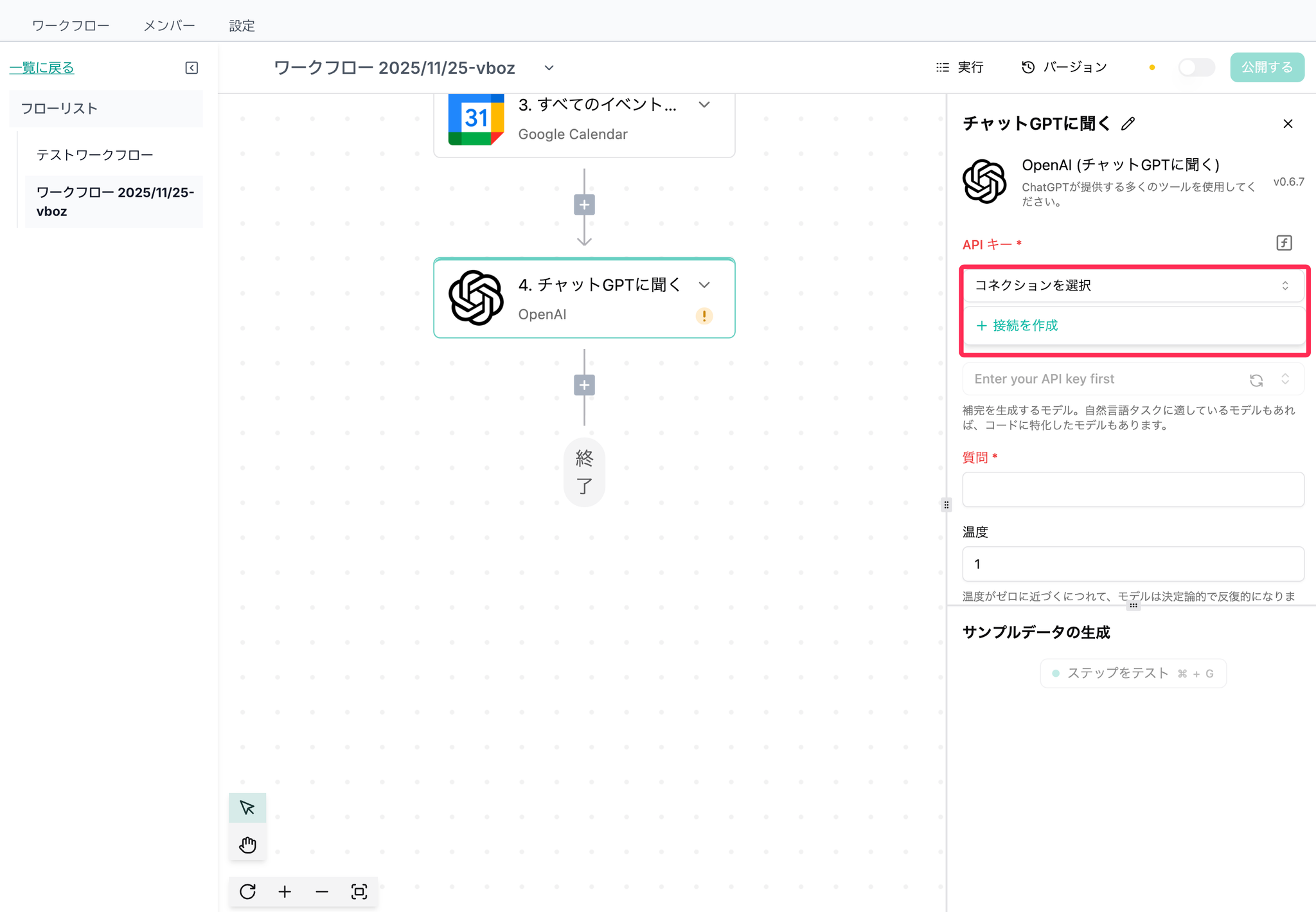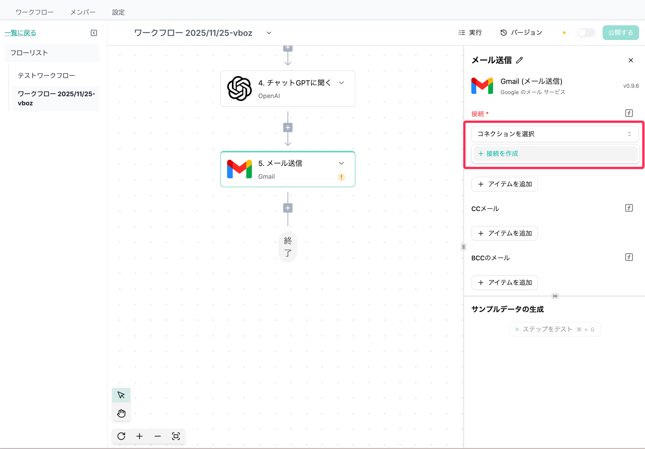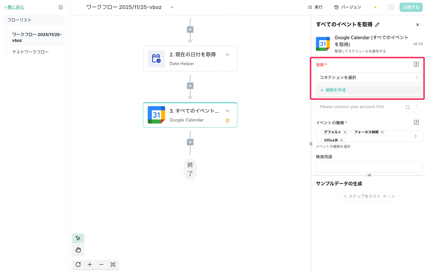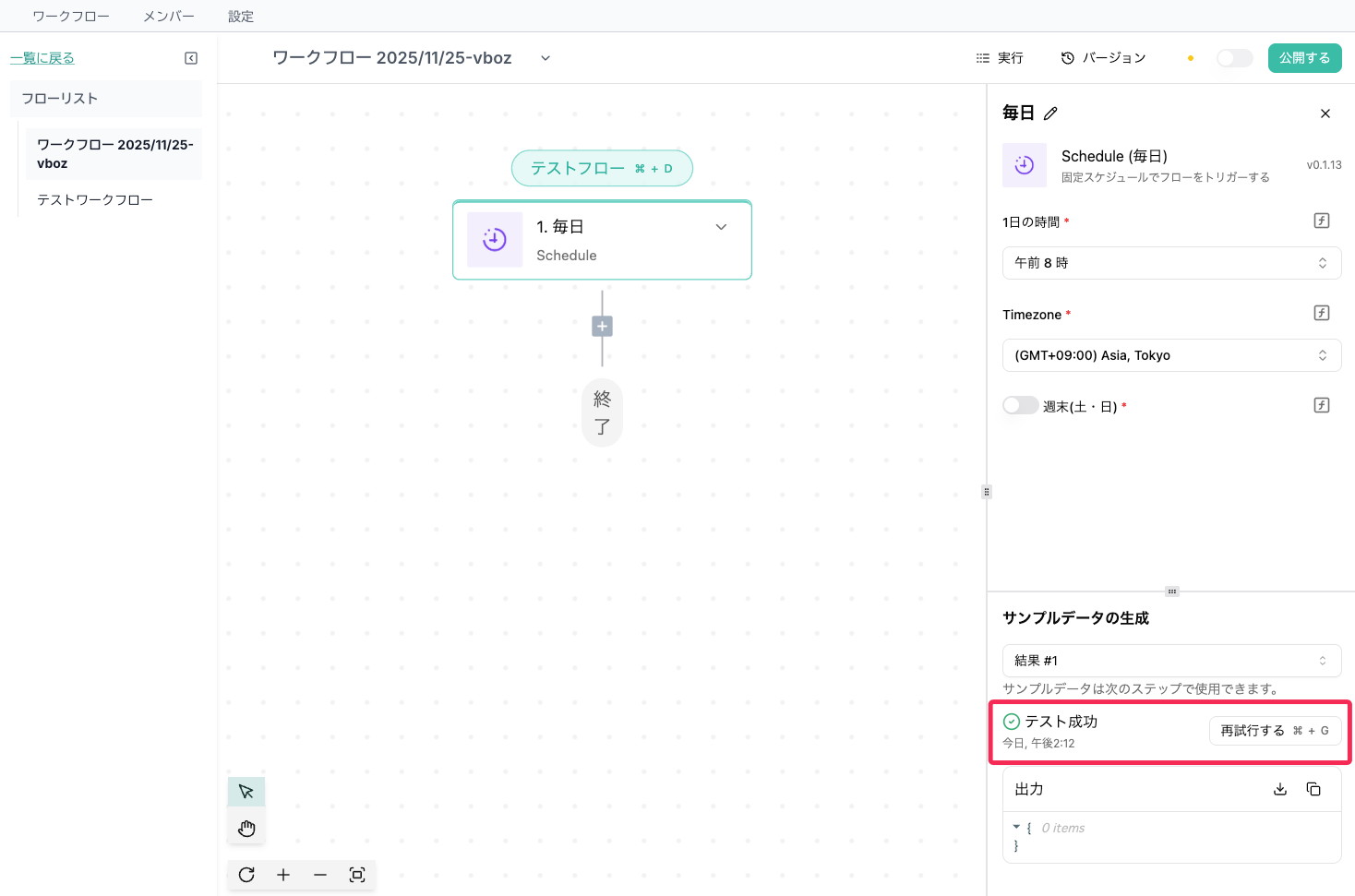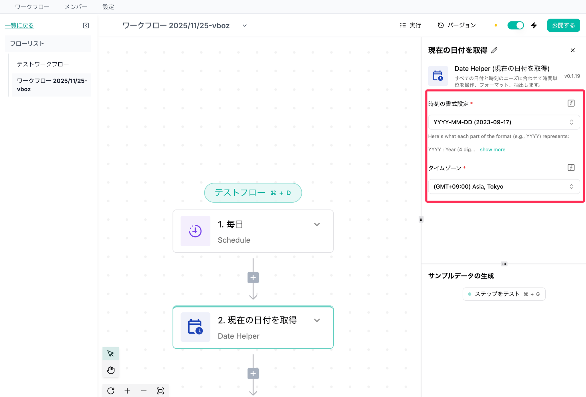 - 右サイドバーのサンプルデータの生成から「ステップをテスト」ボタンを押します。