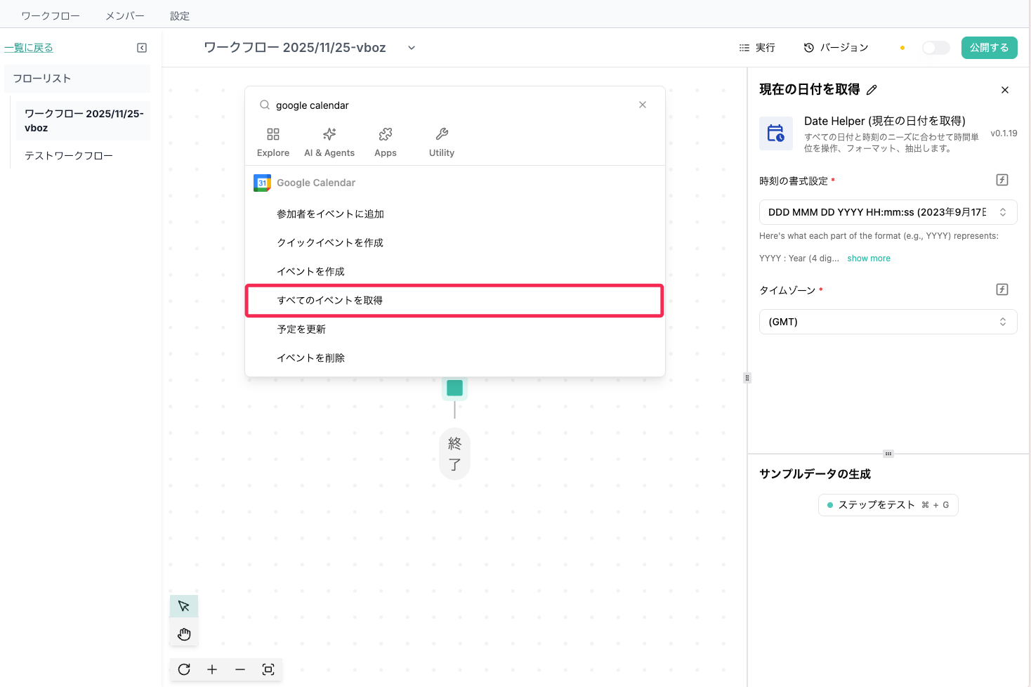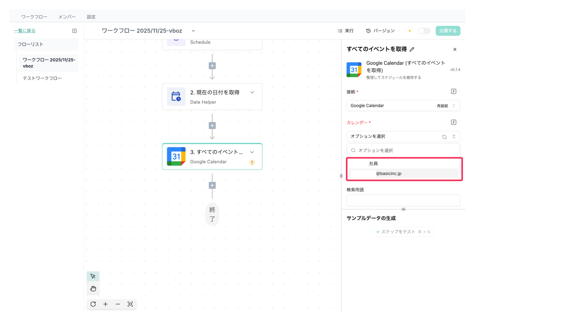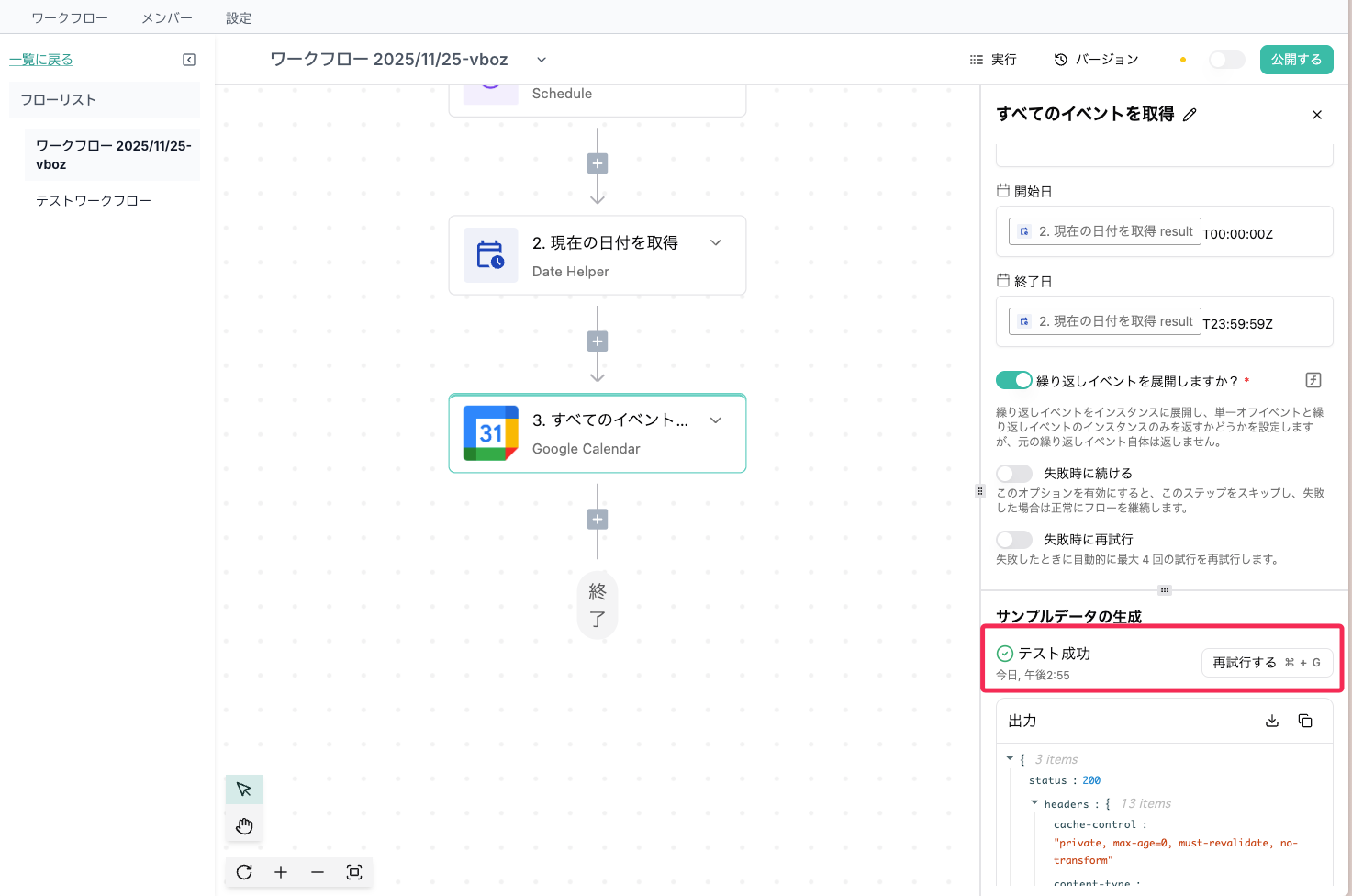 - Google Calendarから「2. 今日の日付の取得」で取得した日のイベントを取得します。
