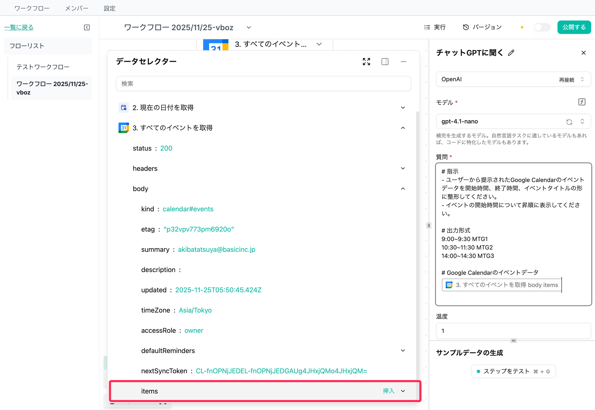 - 右サイドバーで「モデル」はgpt-4.1-nanoに設定し、「質問」のところに以下のプロンプトを入力します。プロンプトの最後には取得したGoogle Caledarのデータを挿入したいのでデータセレクターから下の画像で示したデータ(「3. 全てのイベントを取得」のitems)を選んで挿入を押します。