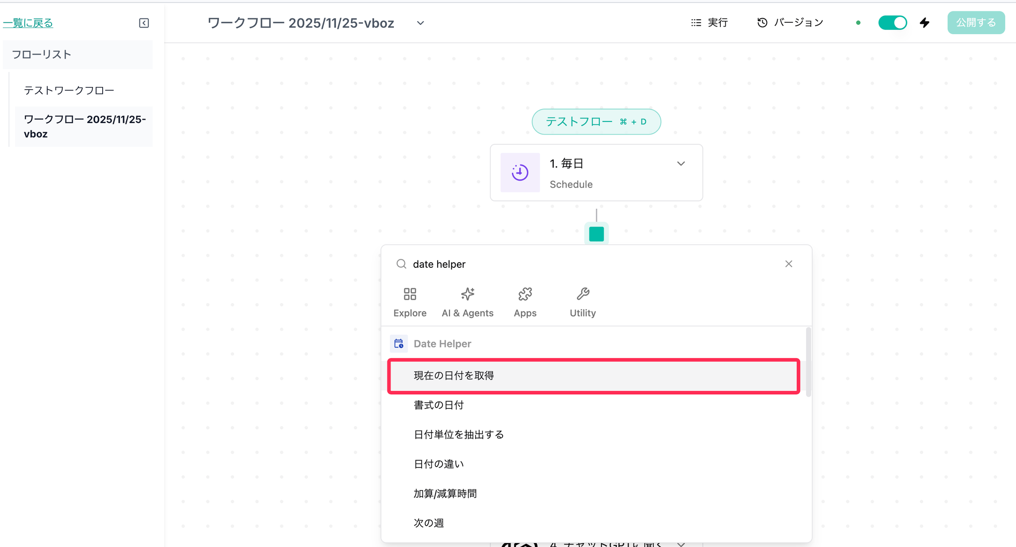 - 「+」ボタンから次のピースの選択画面を開き、検索窓で「date helper」と検索し、続いて「現在の日付を取得」というピースを選択します。