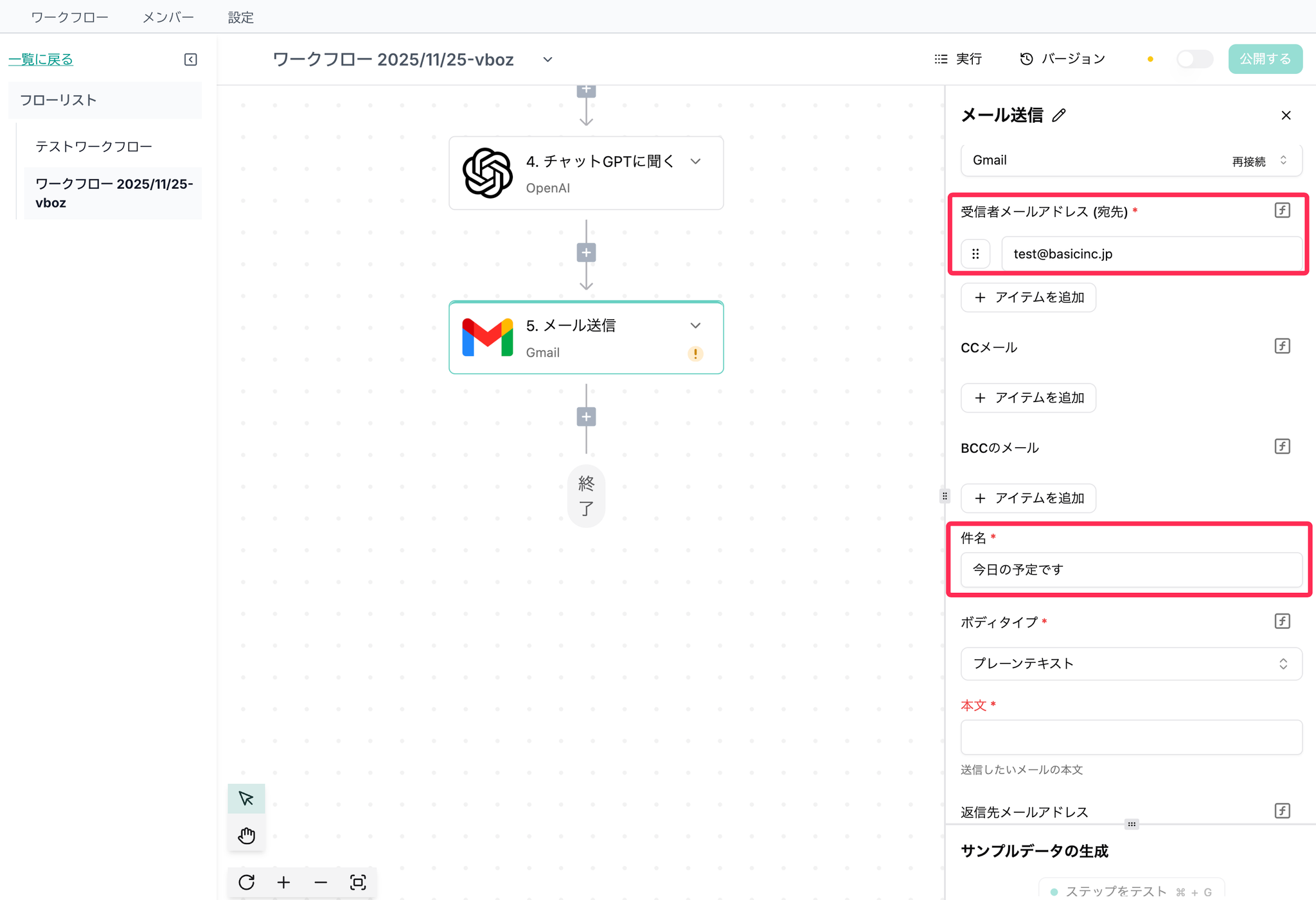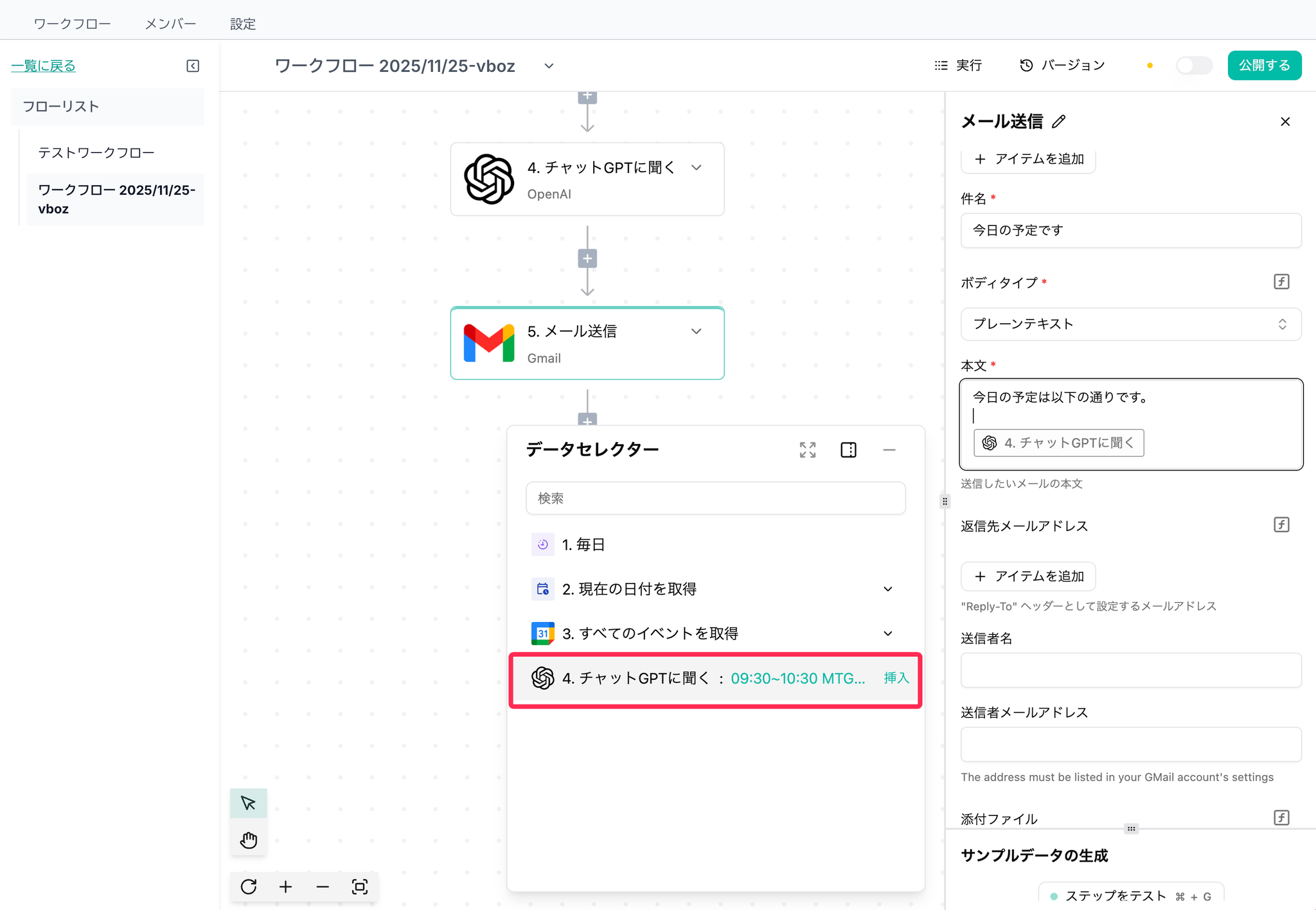 - 右サイドバーの「本文」に送信するメール本文を入れます。メール本文にはChatGPTで整形した予定のデータを挿入したいのでデータセレクターから下の画像で示したデータ(「4. ChatGPTに聞く」のデータ)を選んで挿入を押します。