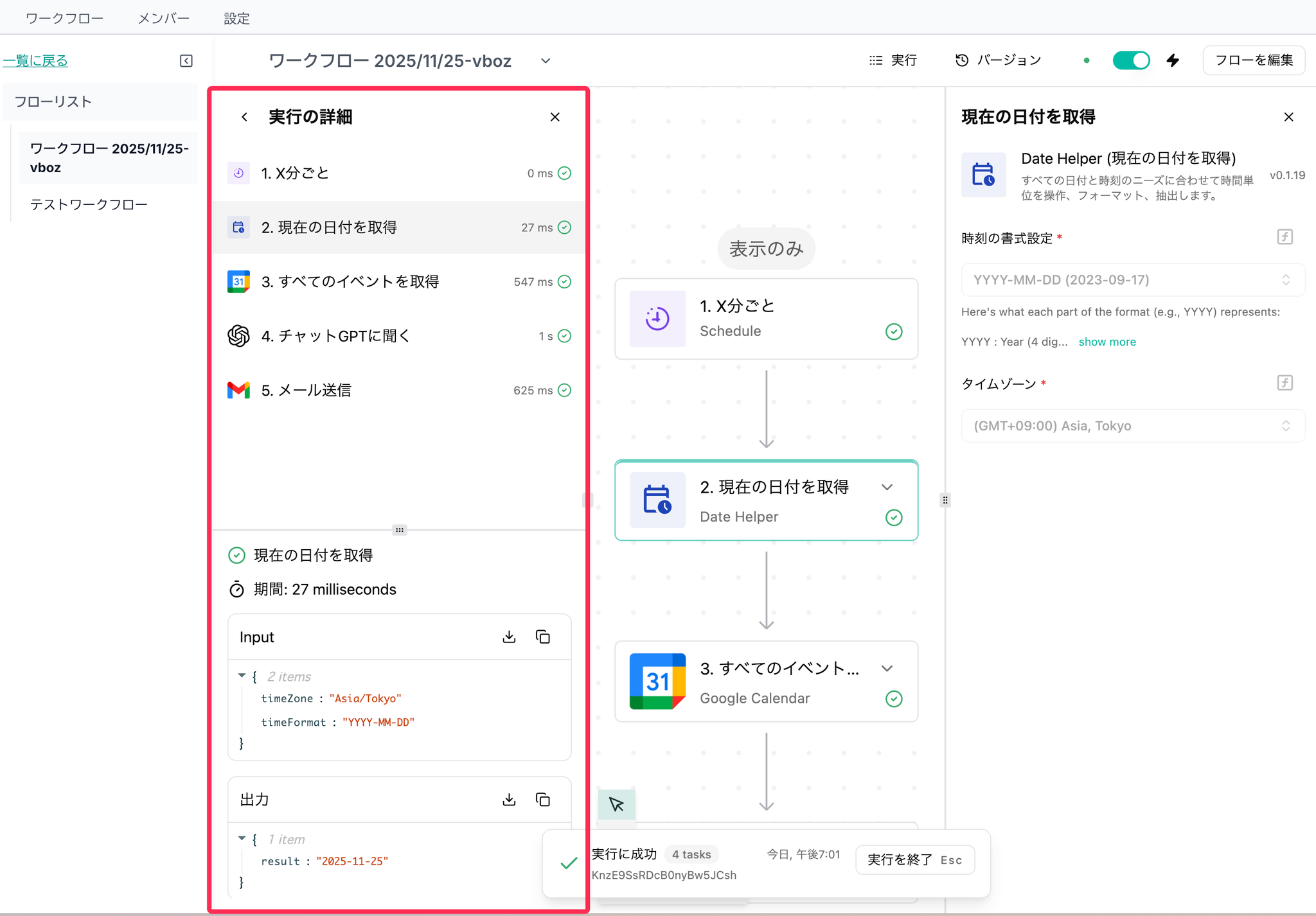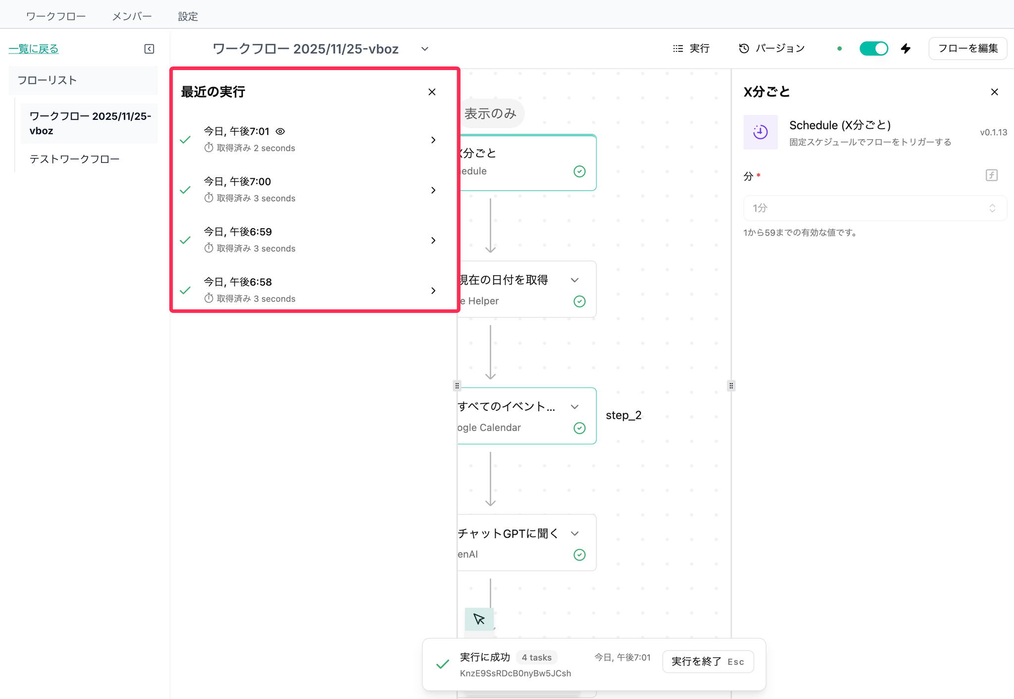 - 実行履歴が表示され、各実行結果のトグルを開くとピースごとの詳細な入出力情報を確認できます。本チュートリアルでは午前8時にスケジュールを設定していますが、便宜のため1分ごとの実行履歴を画像に載せています。