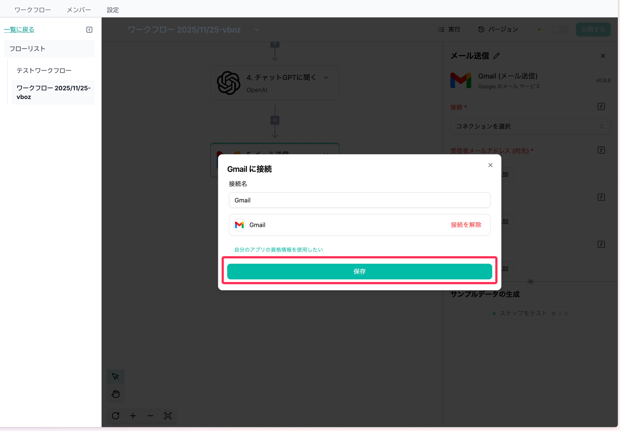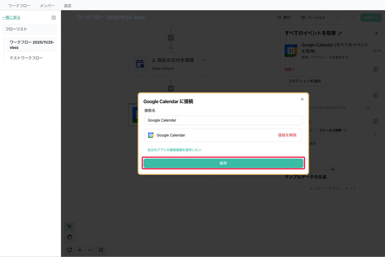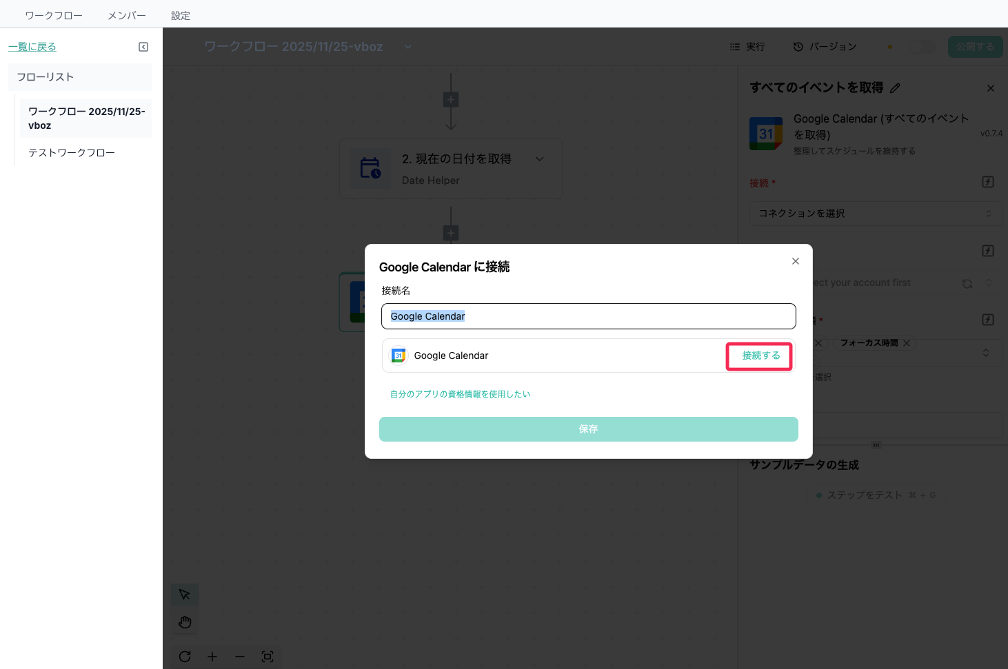 - ウィンドウの「接続する」を押し、Googleアカウント等を選択して許可します。全て終わったら「保存」ボタンを押します。