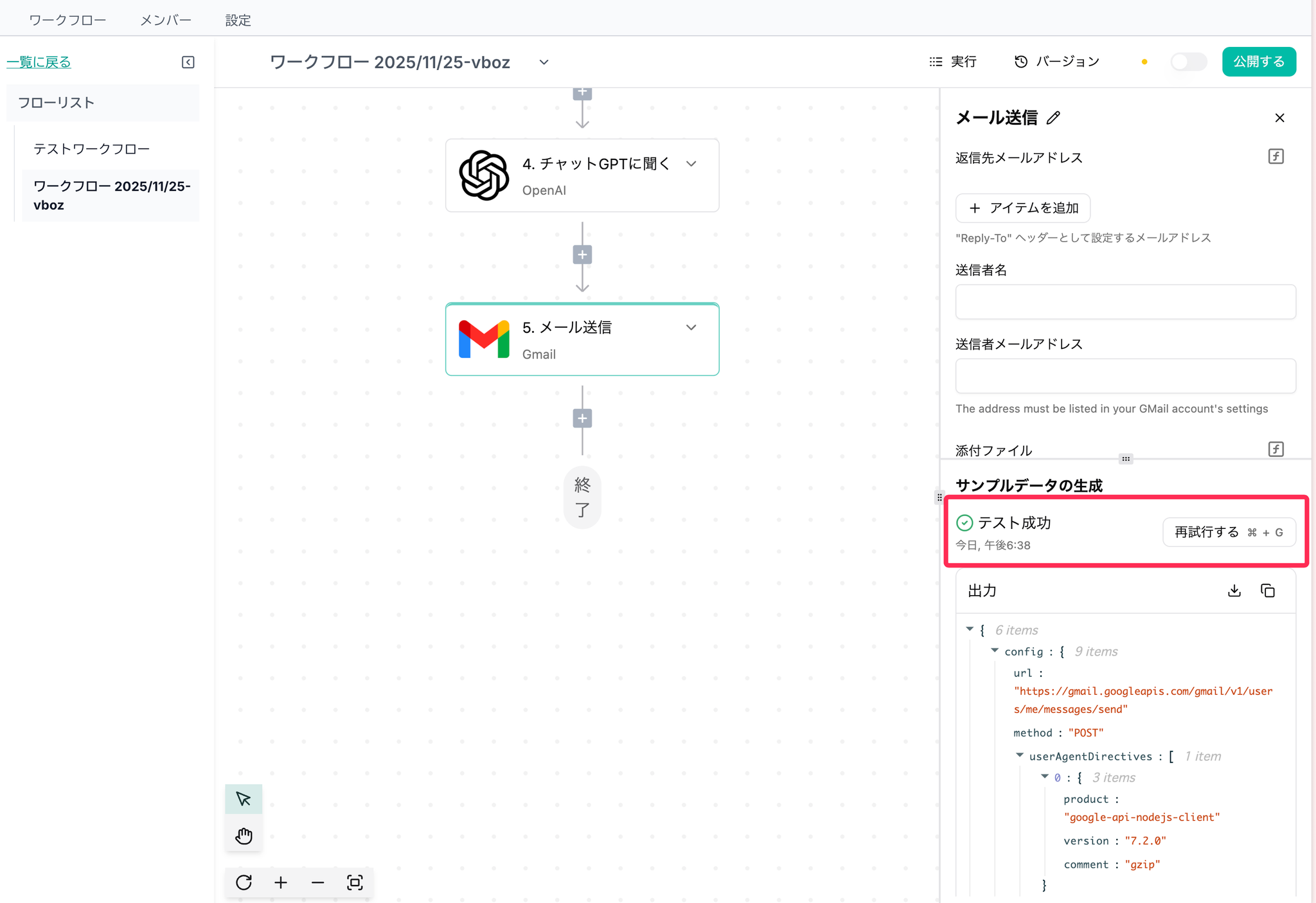 - 「テスト成功」となり、Gmailの下書きにメールが作成されたら成功です。