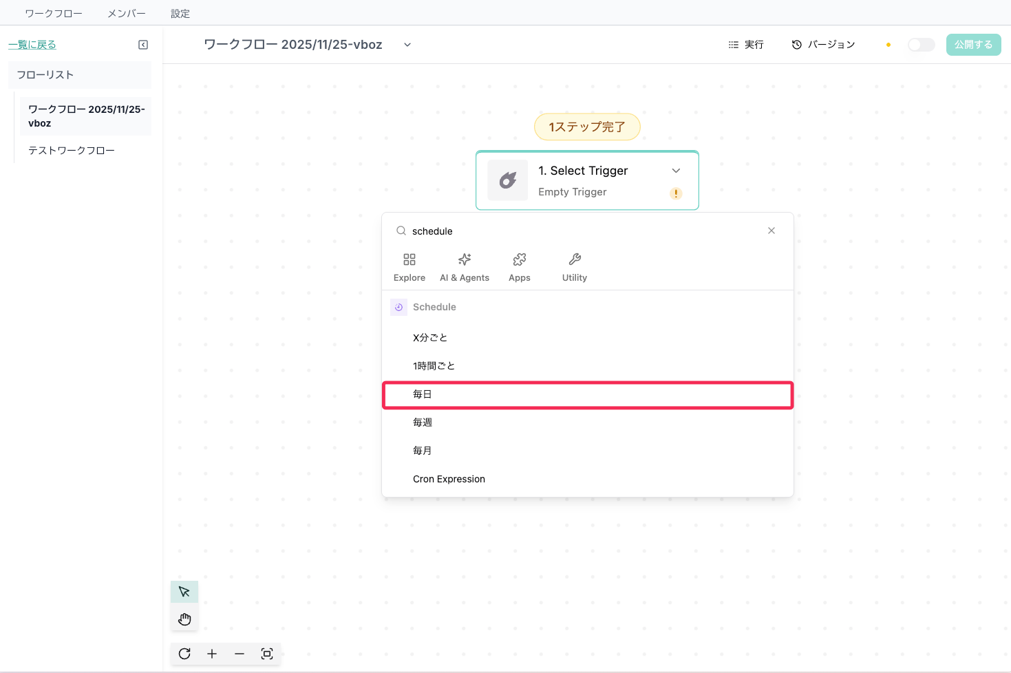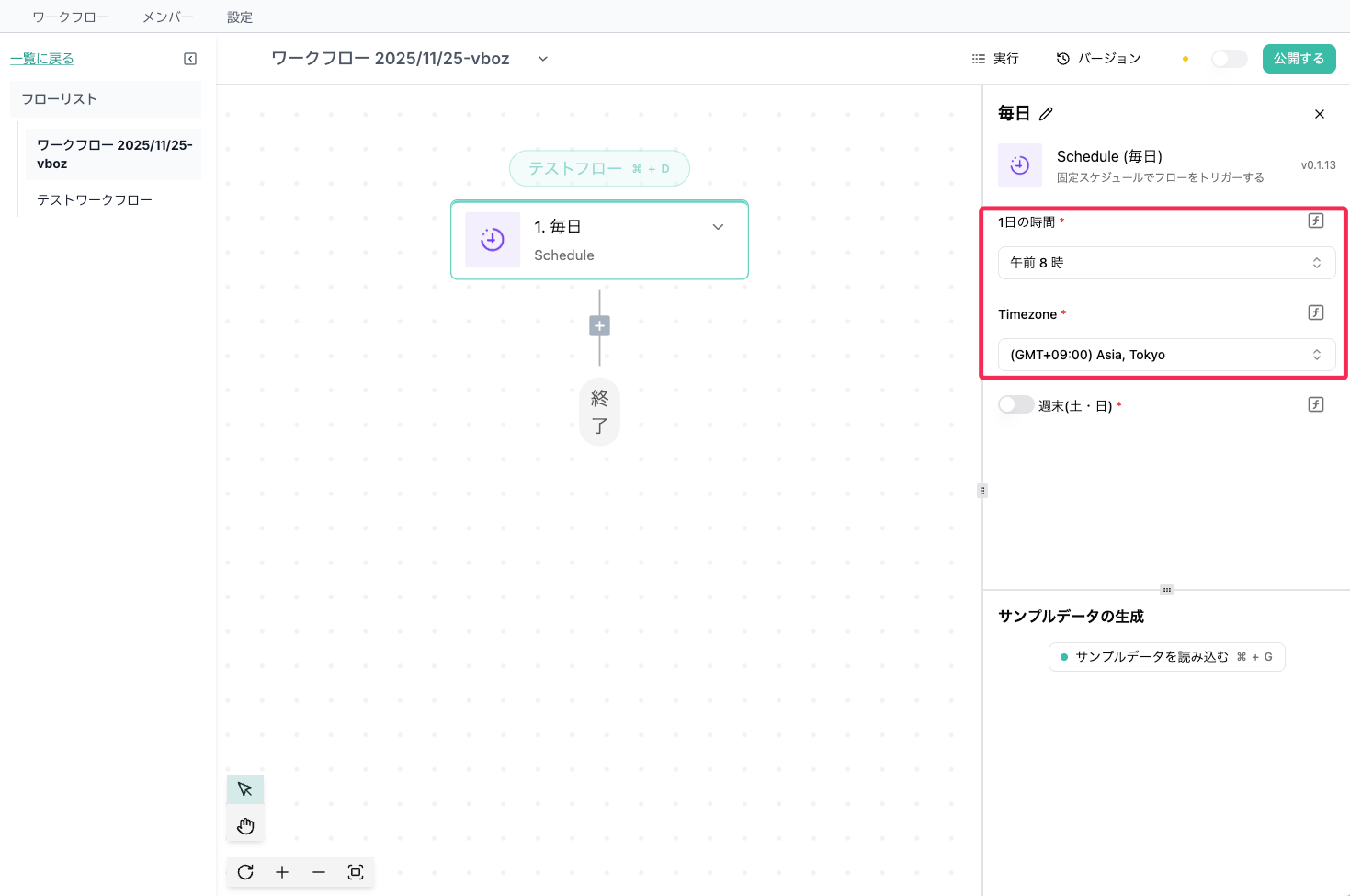 - まずは毎朝08:00にワークフローを起動させる設定を行います。