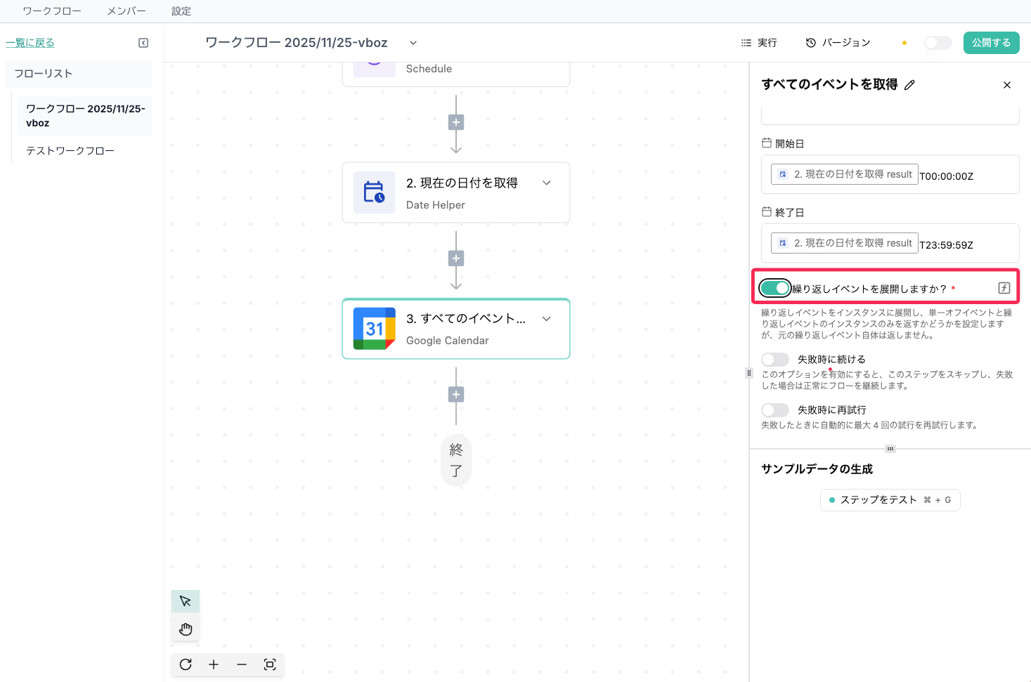 - 「繰り返しイベントを短会しますか?」のトグルをONにして、Google Caledarの繰り返しイベントについて今日のデータに絞って取得する設定を行います。