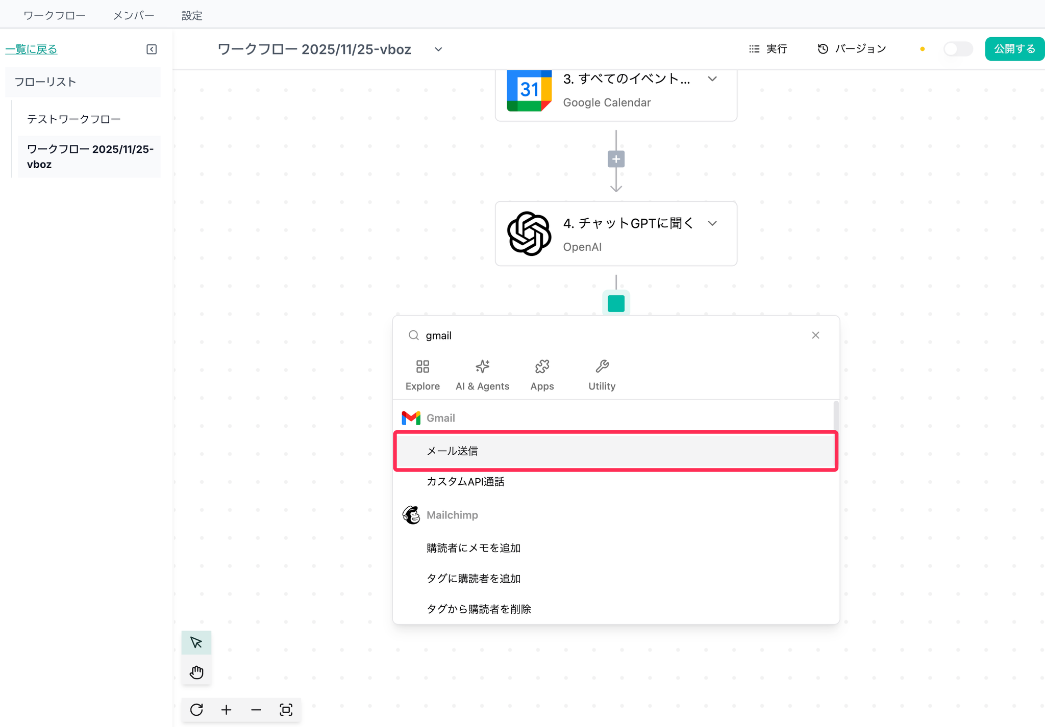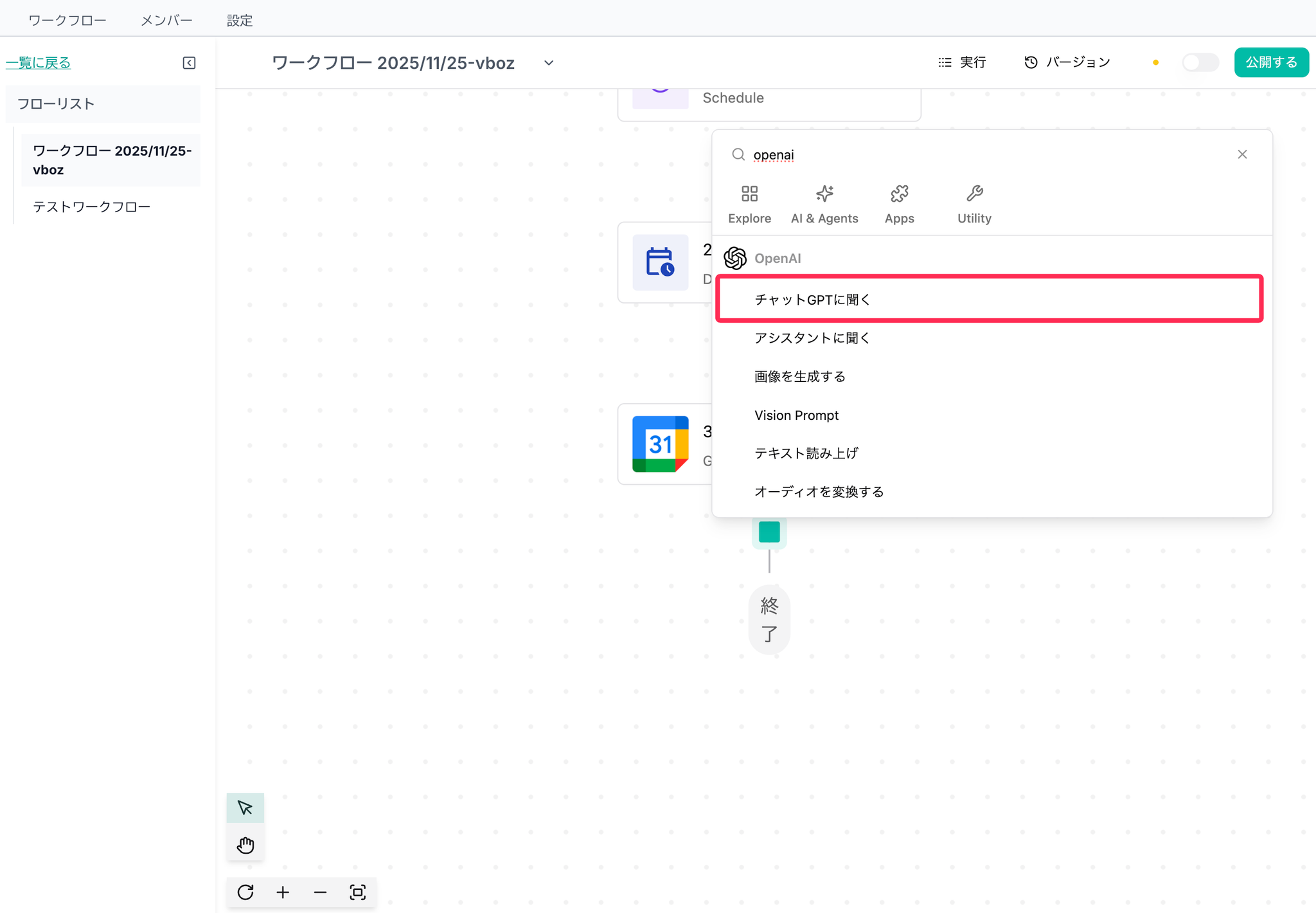 - 「+」ボタンから次のピースの選択画面を開き、検索窓で「openAI」と検索します。「チャットGPTに聞く」というピースを選択します。
