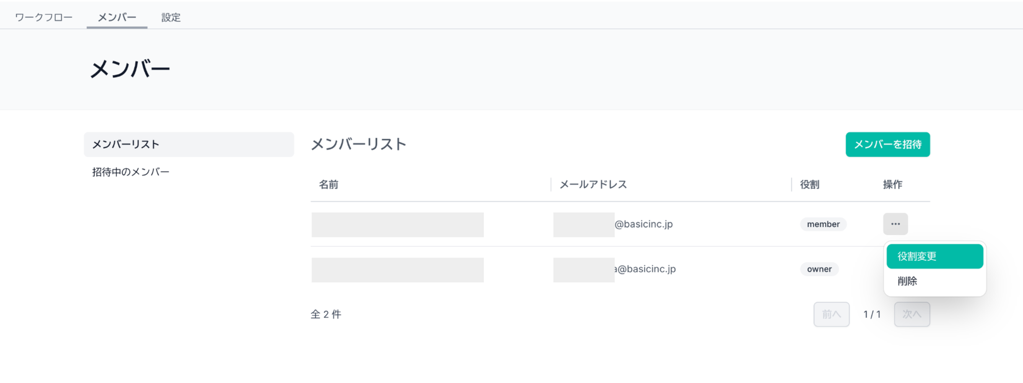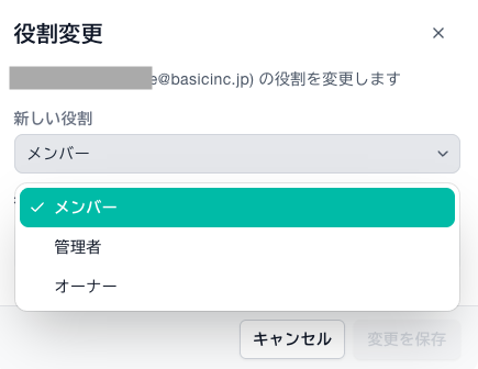 - 招待メールが承諾されると「メンバー」という役割でメンバー追加されます。役割を変更したいときは3点リーダーの「役割変更」から変更できます。メンバーを削除する場合もこちらから削除可能です。