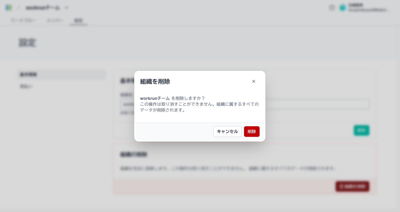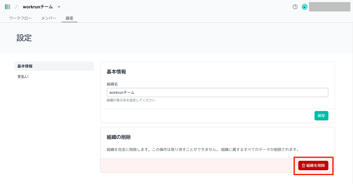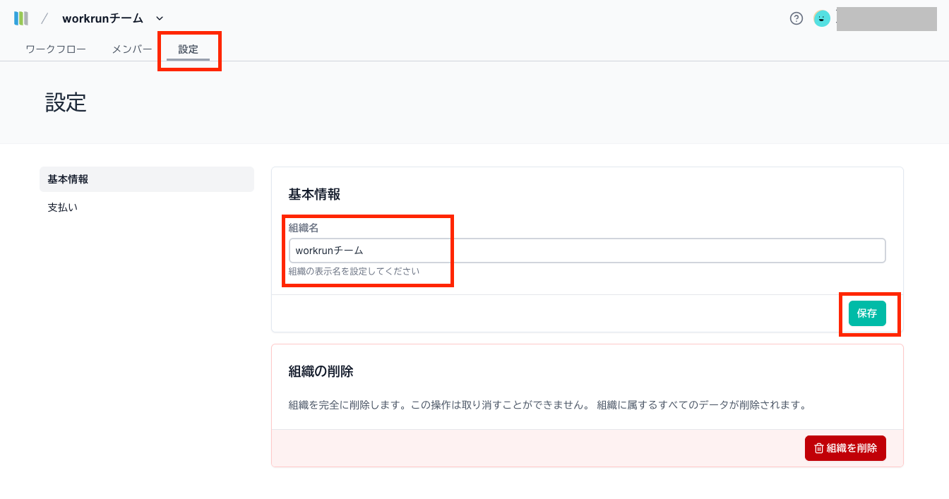 - 「設定」タブを開き「組織名」を変更後、「保存」を押します。