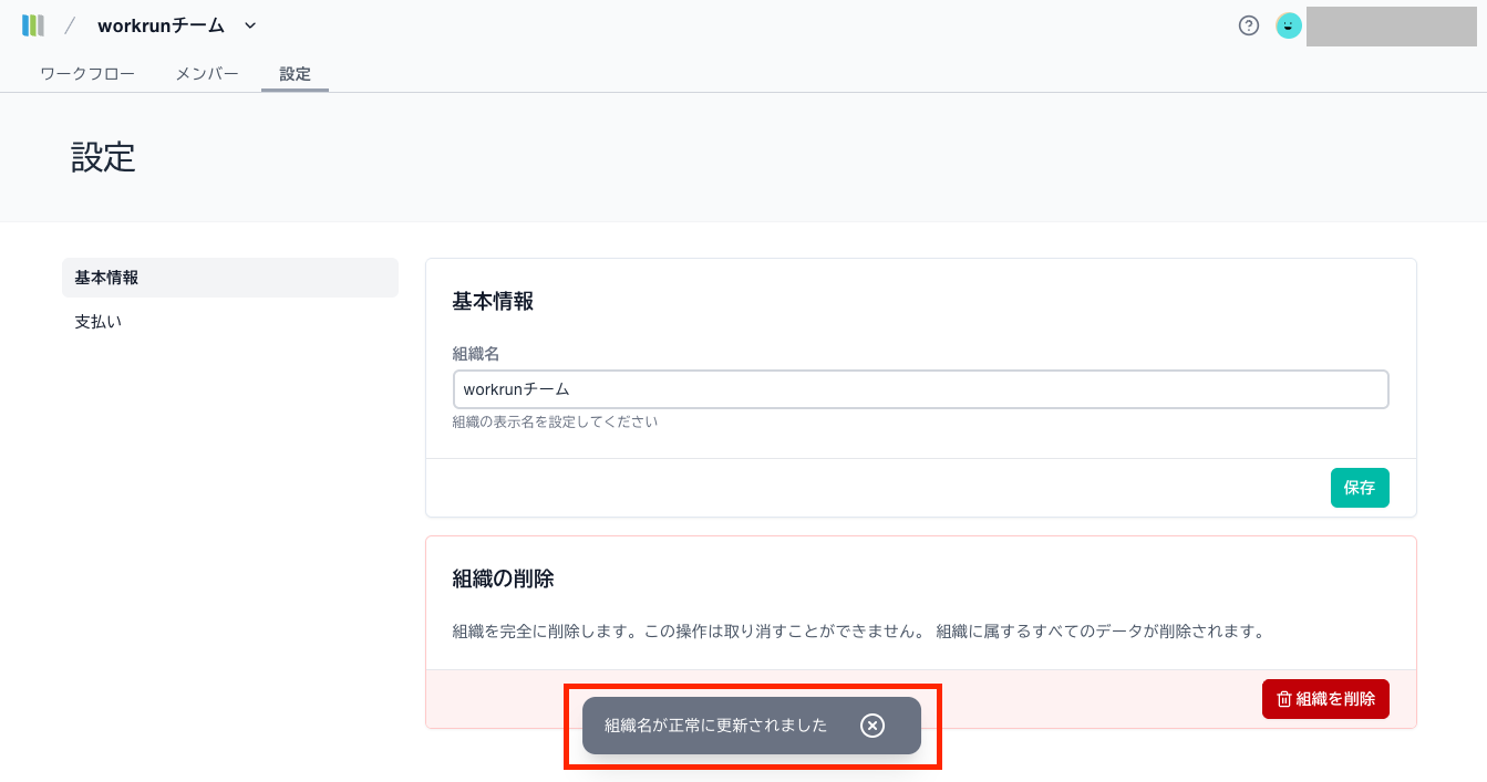 - 「組織名が正常に更新されました」と表示されたら完了です。