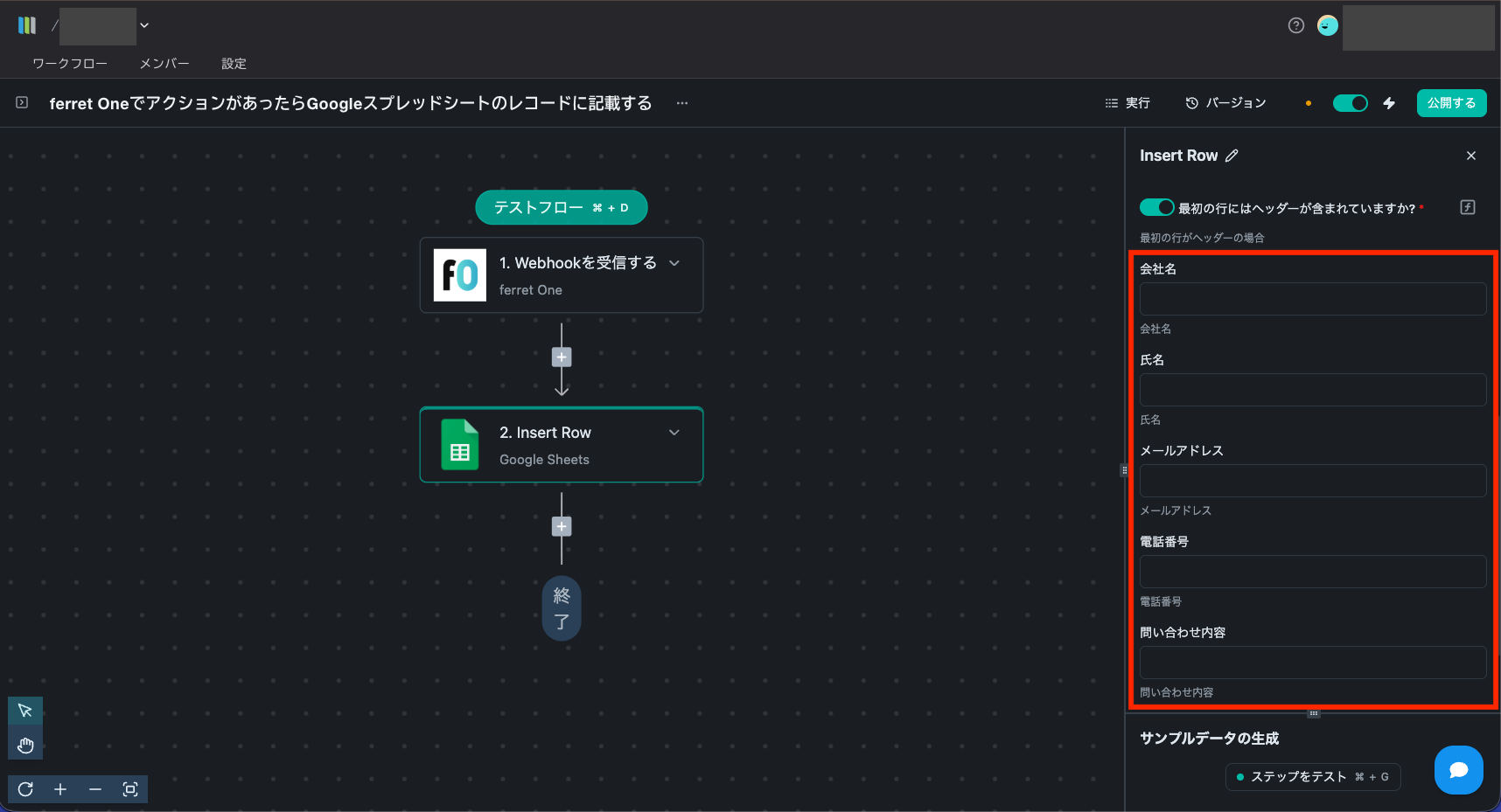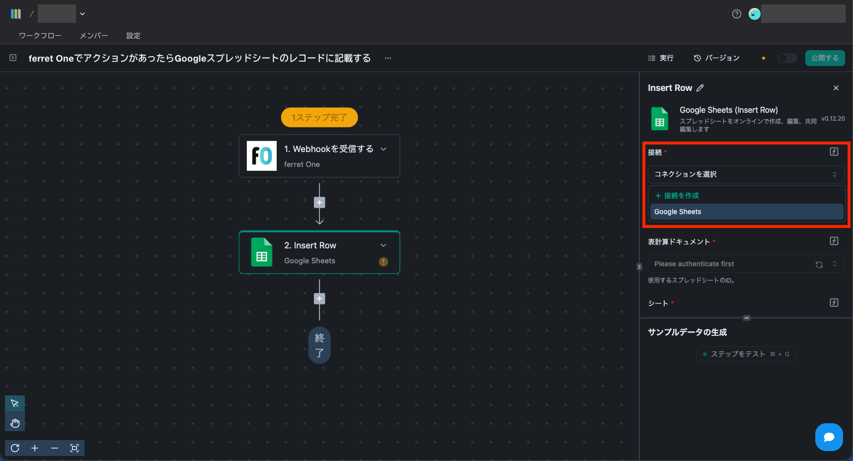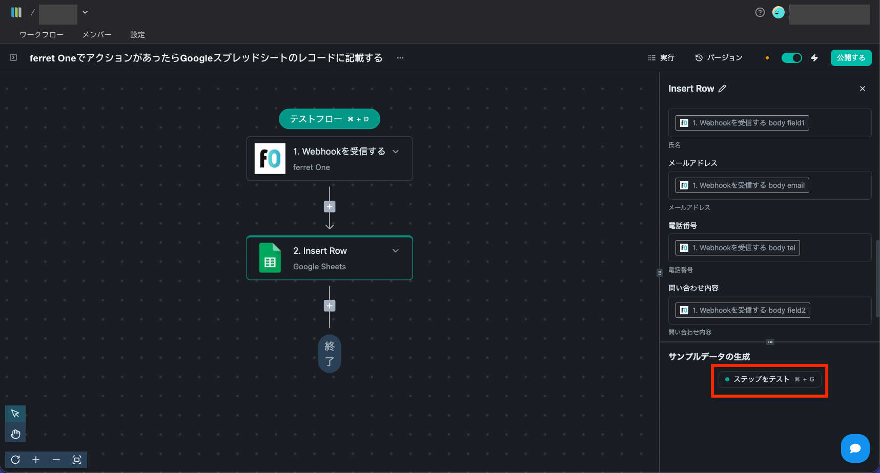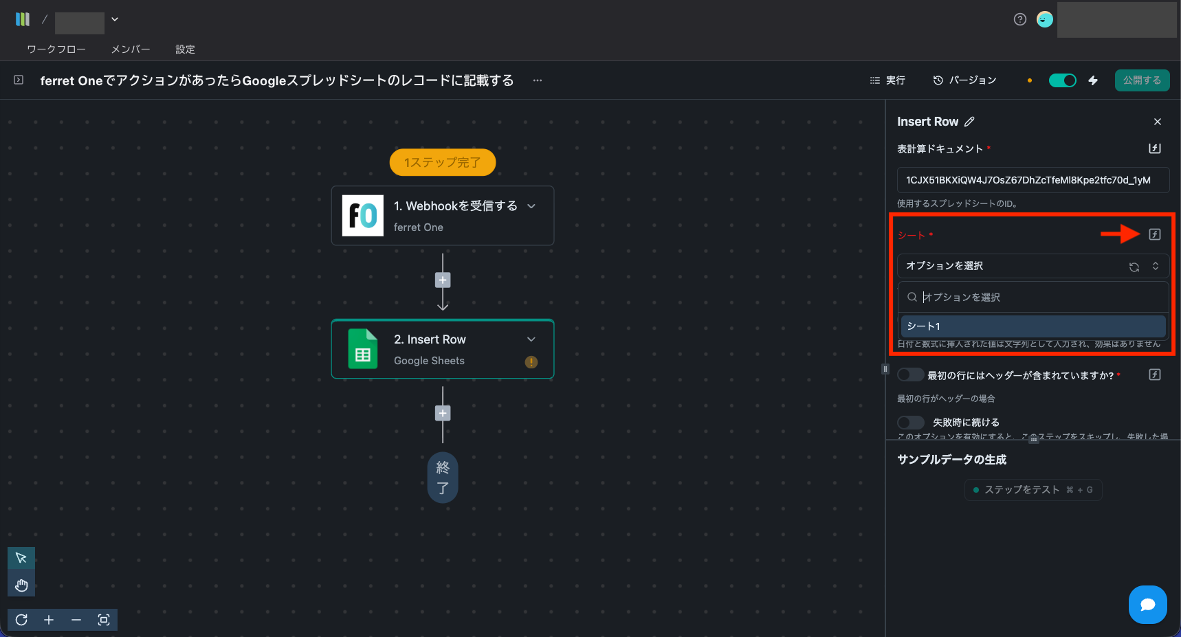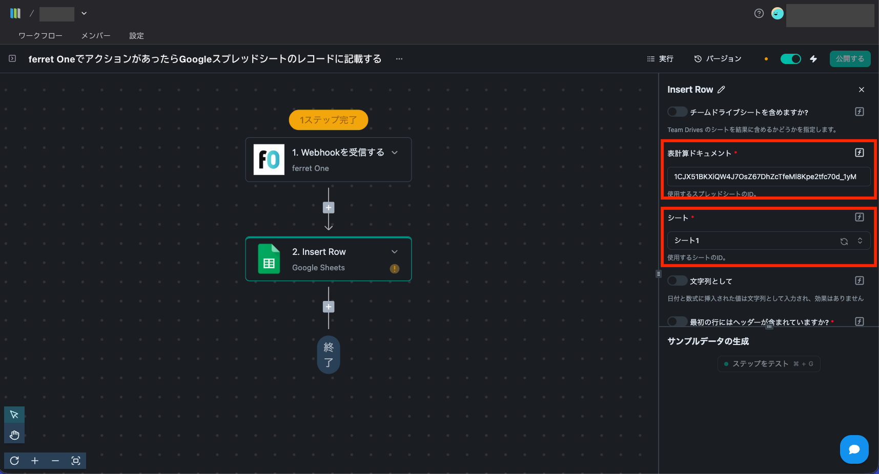ferret OneでアクションがあったらGoogleスプレッドシートのレコードに記載する