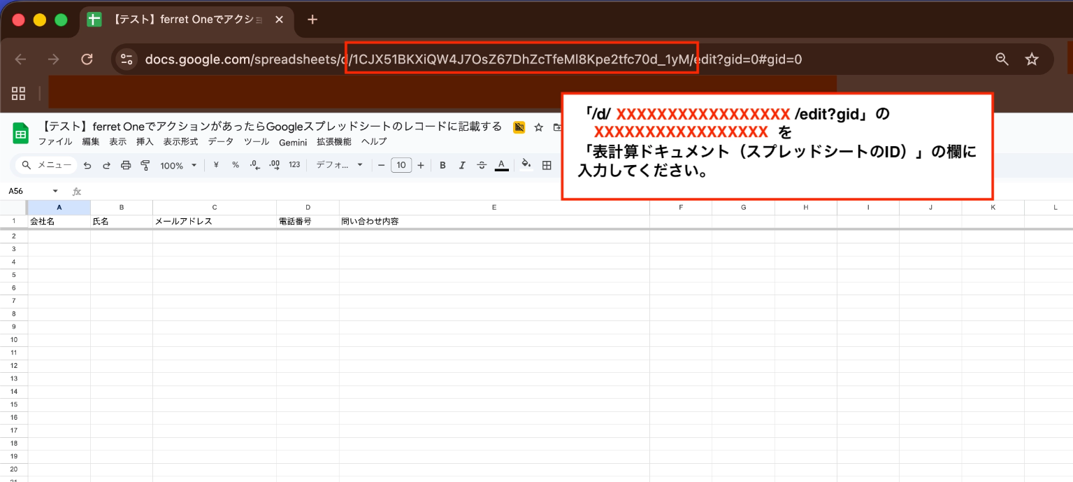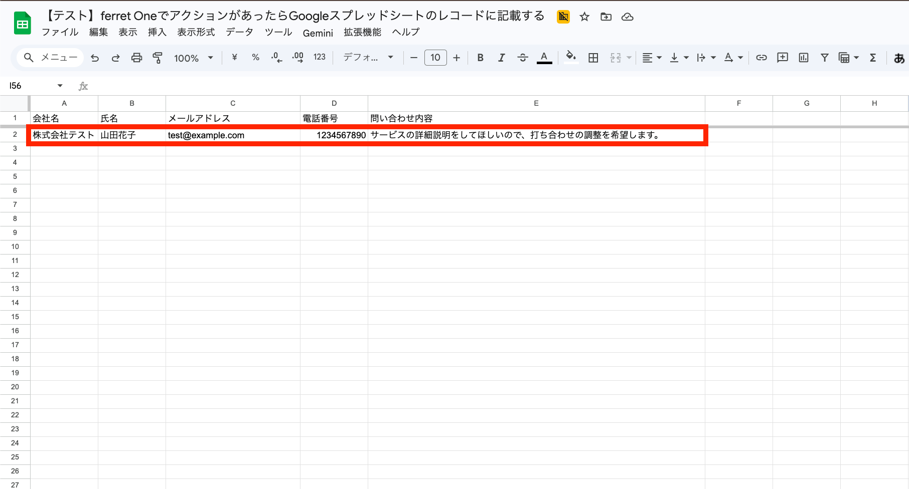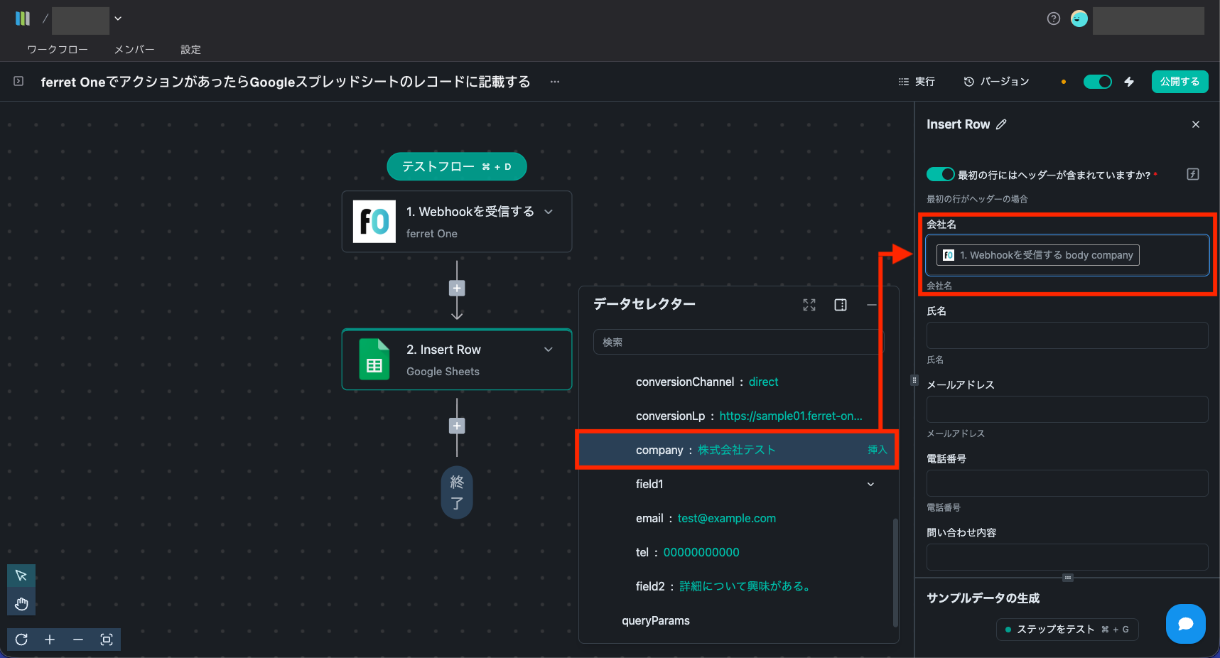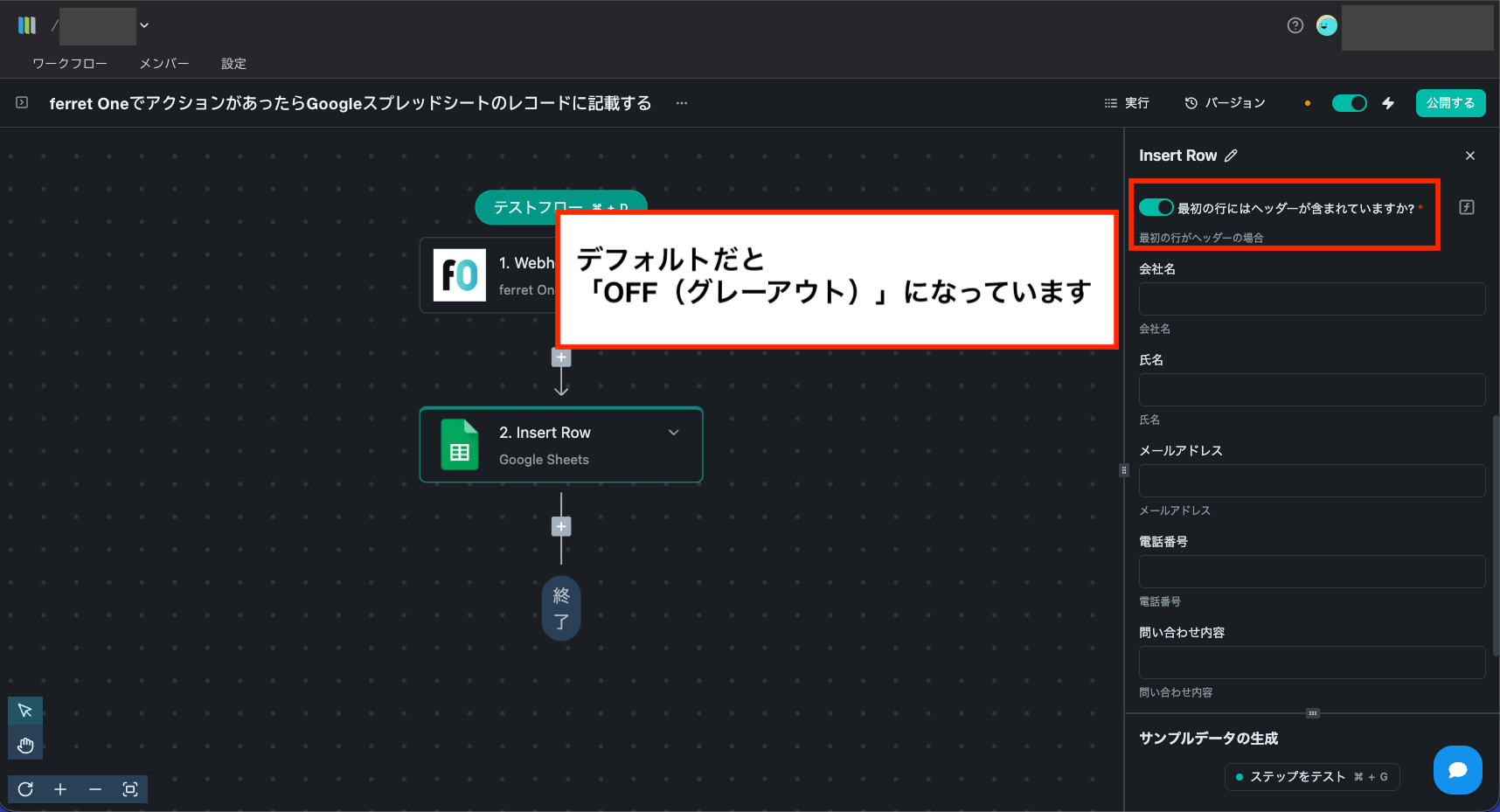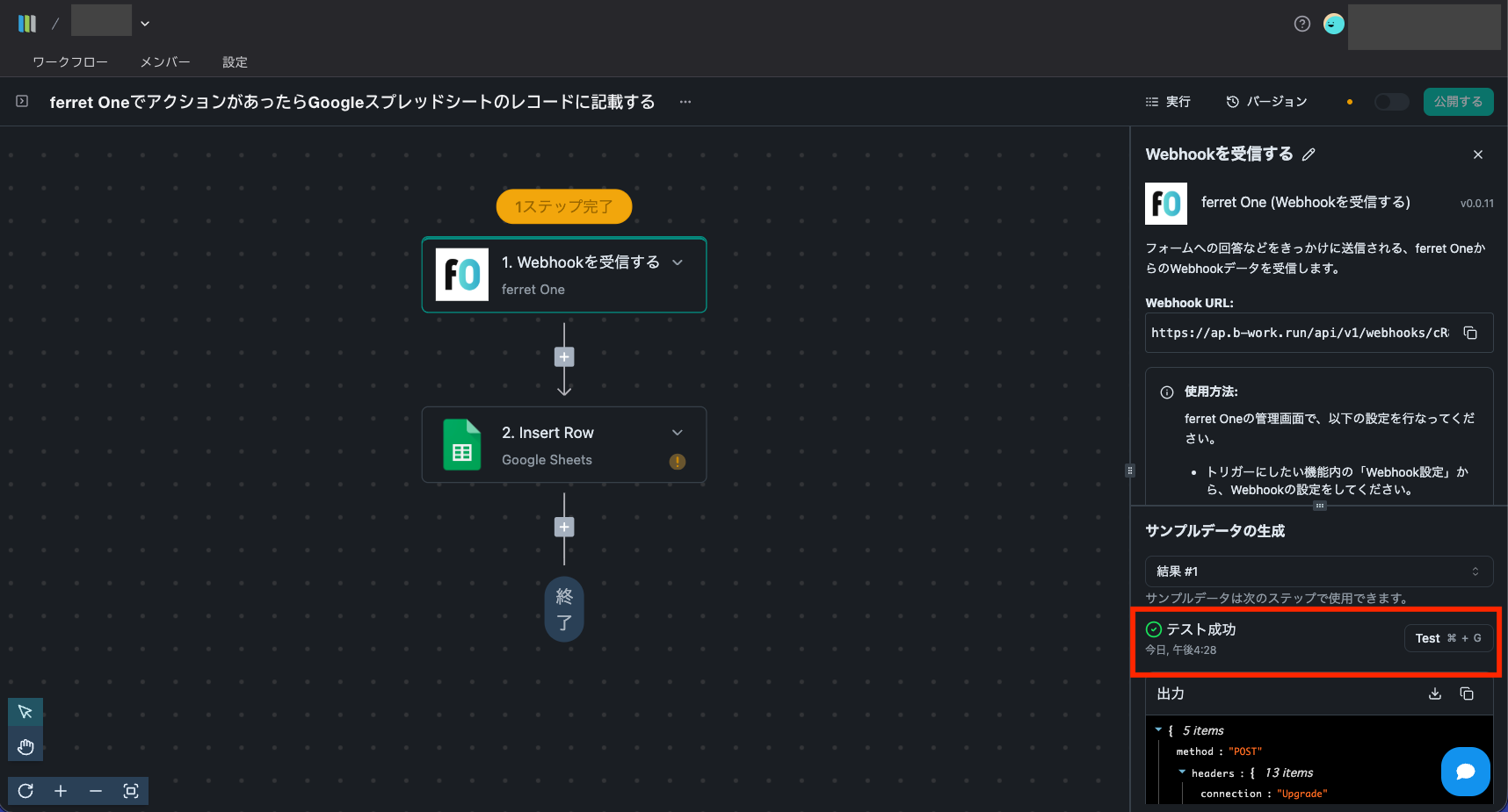 ferret OneでアクションがあったらGoogleスプレッドシートのレコードに記載する