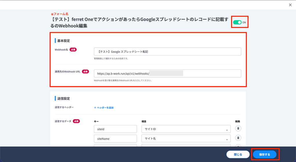Step 4:ferret One管理画面のフォーム編集画面より、Webhook設定を開き、「連携先のWebhook URL」に貼り付ける