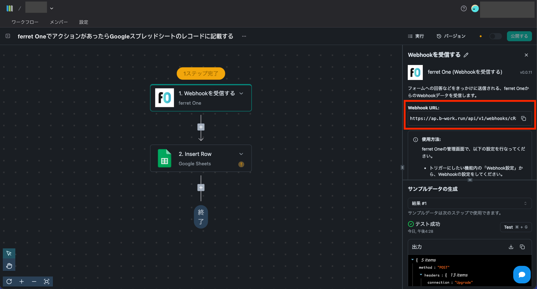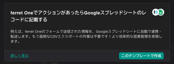 - 「ferret Oneでアクションがあったら、Googleスプレッドシートのレコードに記載する」というテンプレから作るとスムーズです。