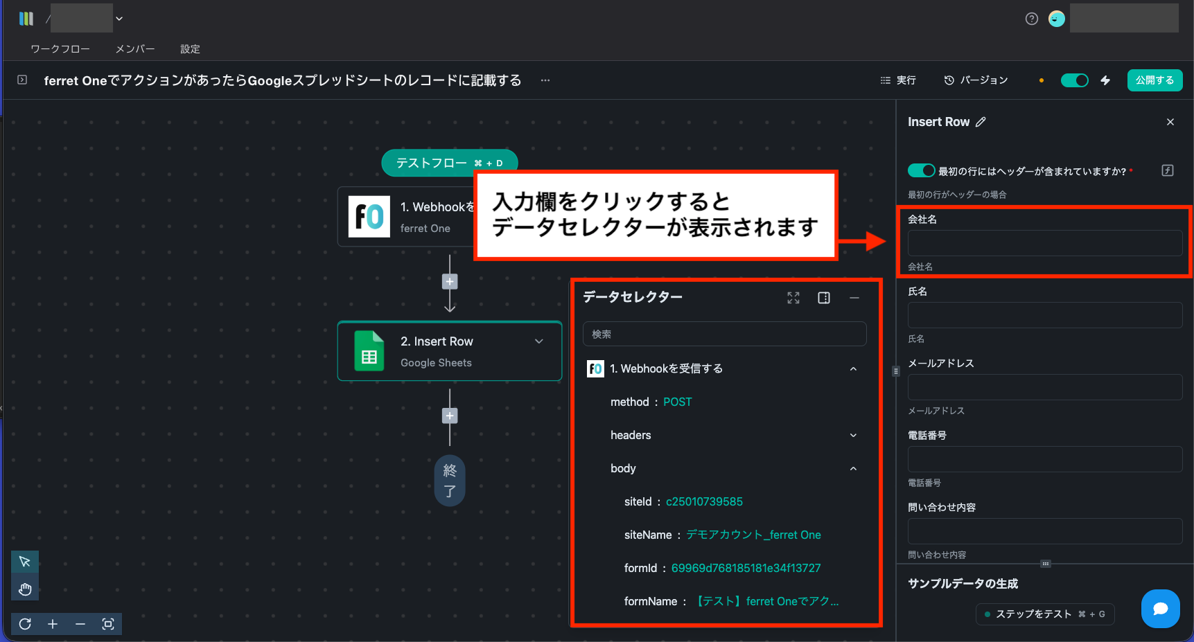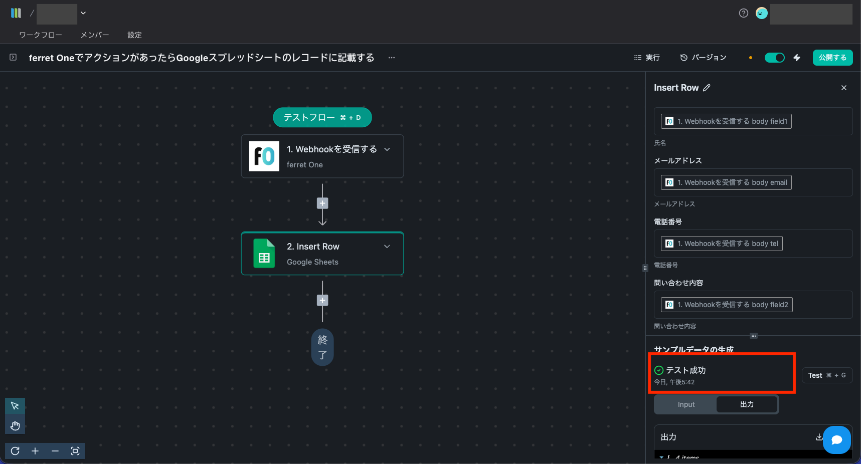 このワークフローでは、ferret Oneでのフォーム回答をトリガーとして、任意のシートに自動転記します。