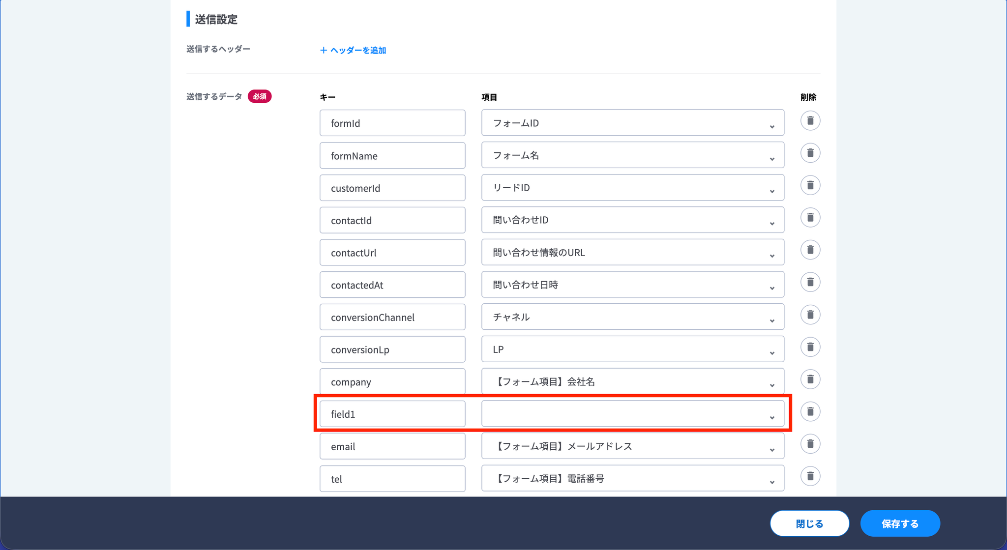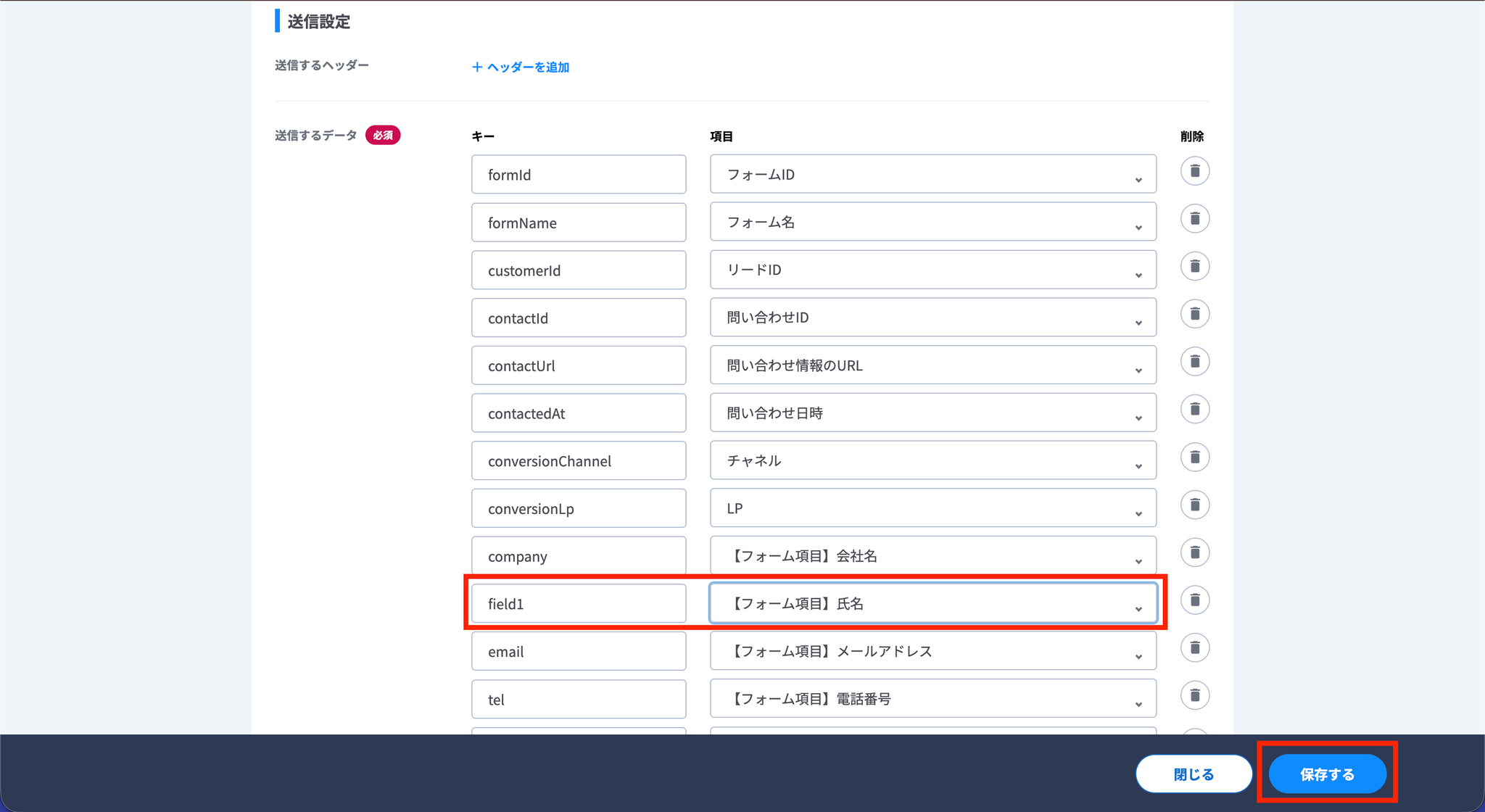 - 項目名が空白だと、Webhookを設定しても情報を取得することができません。プルダウンメニューからフォーム項目を選択した上で、保存をおこなってください。