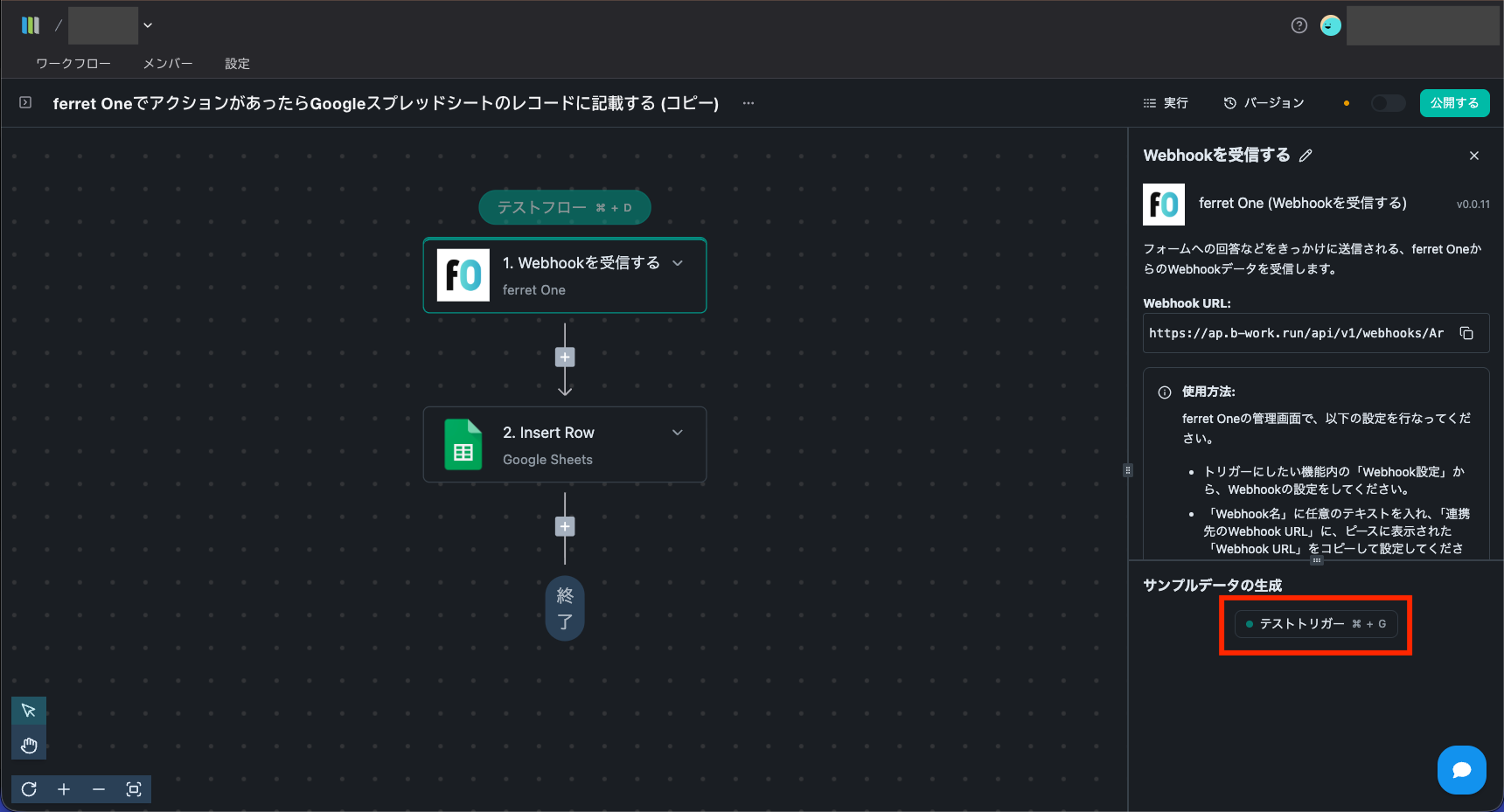 - workrunの画面に戻り、サンプルデータ作成内にある「テストトリガー」のボタンをクリックしてください。