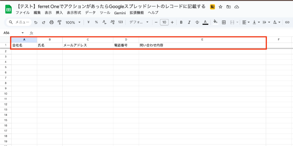 - フォームの回答を記載するスプレッドシートを新規作成し、マッピングしたい項目を用意します。