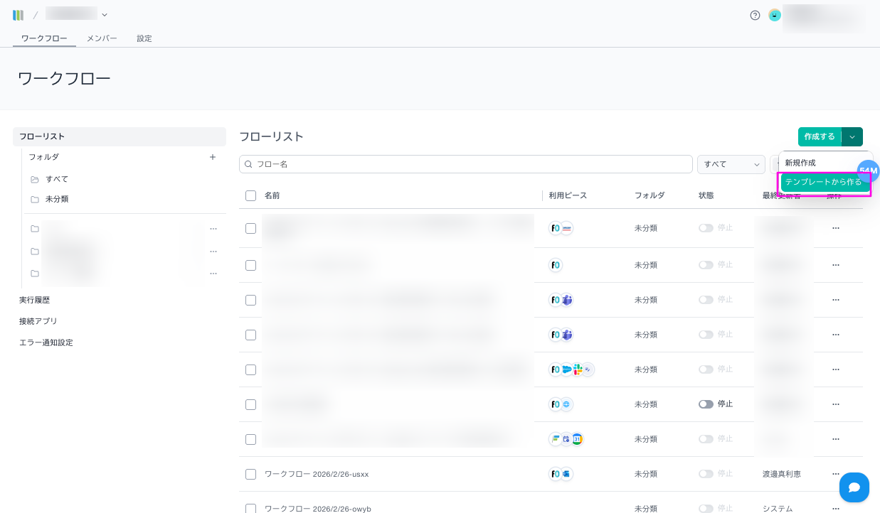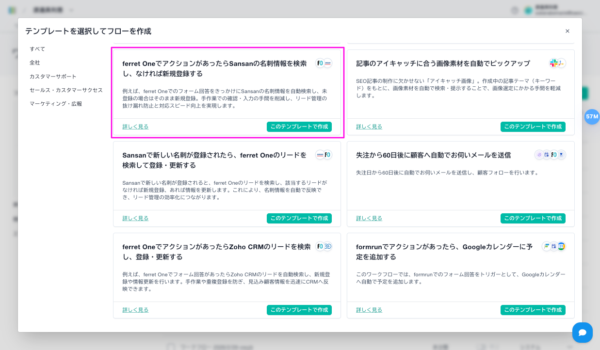 - 「ferret OneでアクションがあったらSansanの名刺情報を検索し、なければ新規登録する」というテンプレを選択します