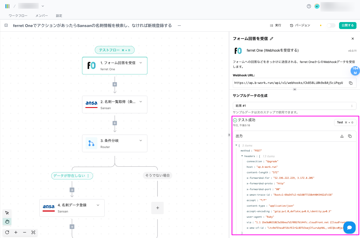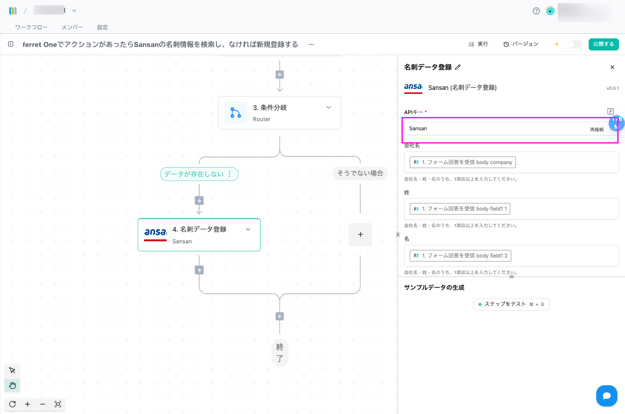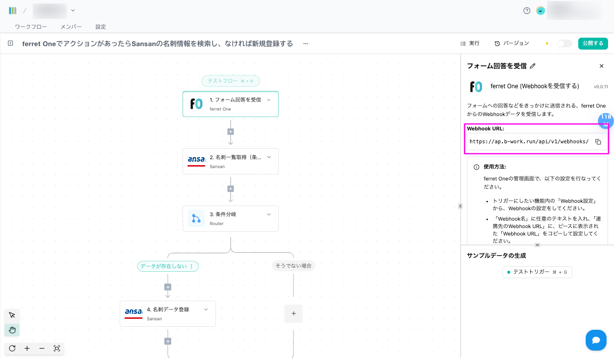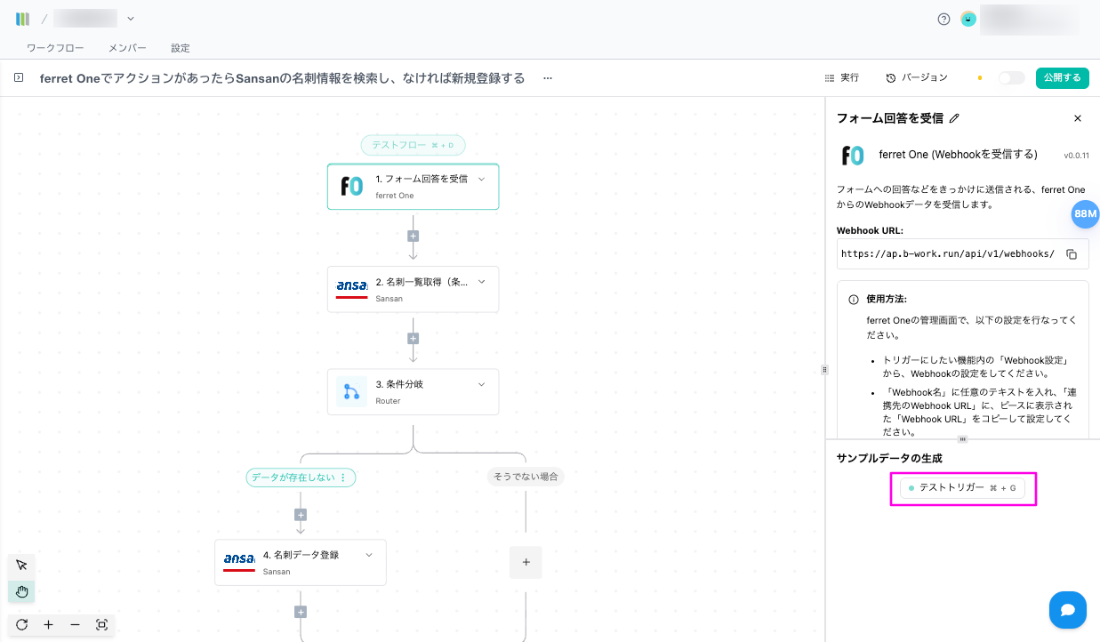 このワークフローでは、ferret Oneでのフォーム回答をトリガーとして、Sansanへ自動で連携します。