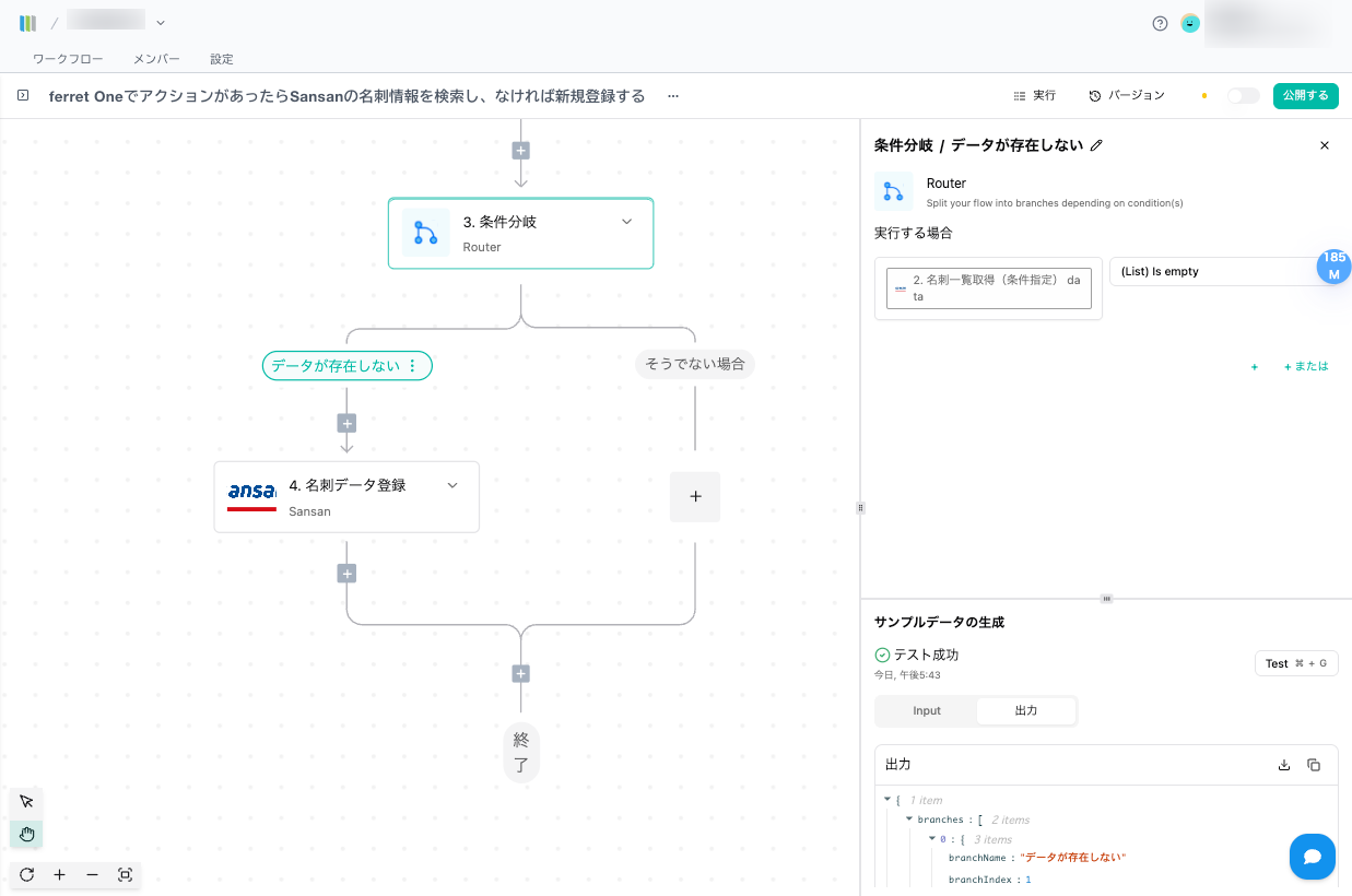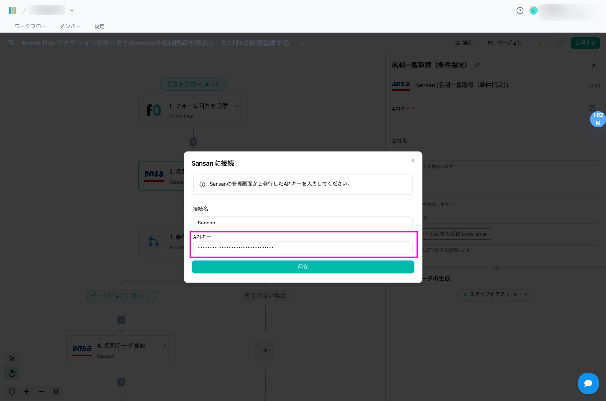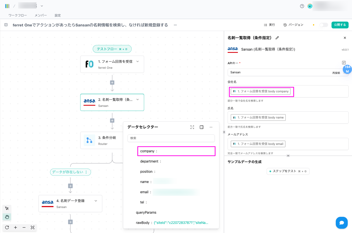 このワークフローでは、ferret Oneでのフォーム回答をトリガーとして、Sansanへ自動で連携します。