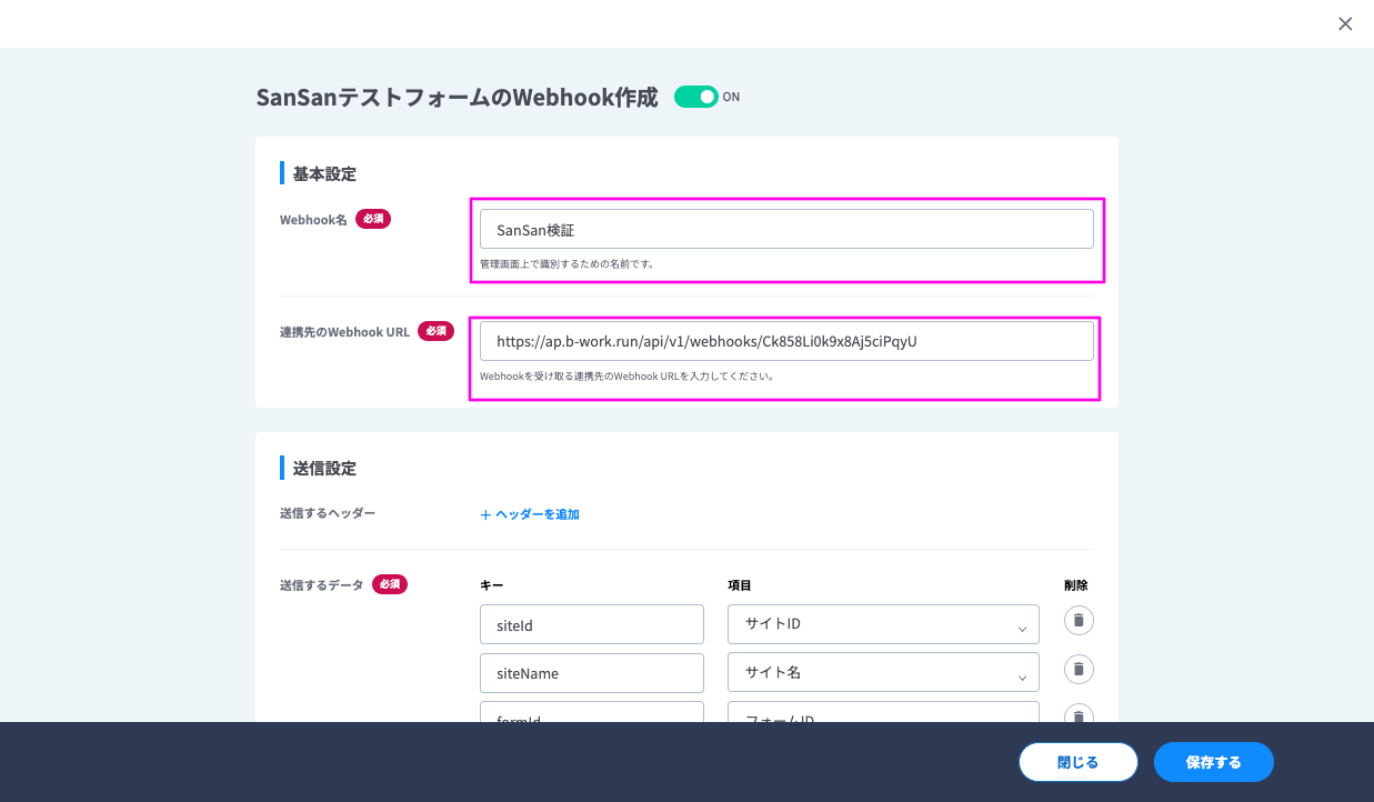 Step 4:ferret Oneの管理画面より、該当フォームのWebhook設定を開き、「連携先のWebhook URL」に貼り付ける