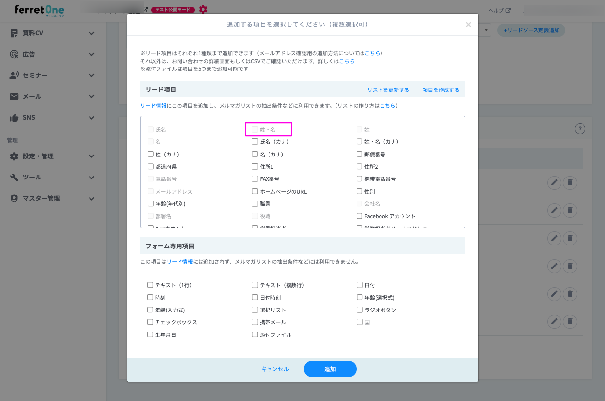 スムーズに連携するため、ferret One側のフォームも姓・名の形式にしてください。