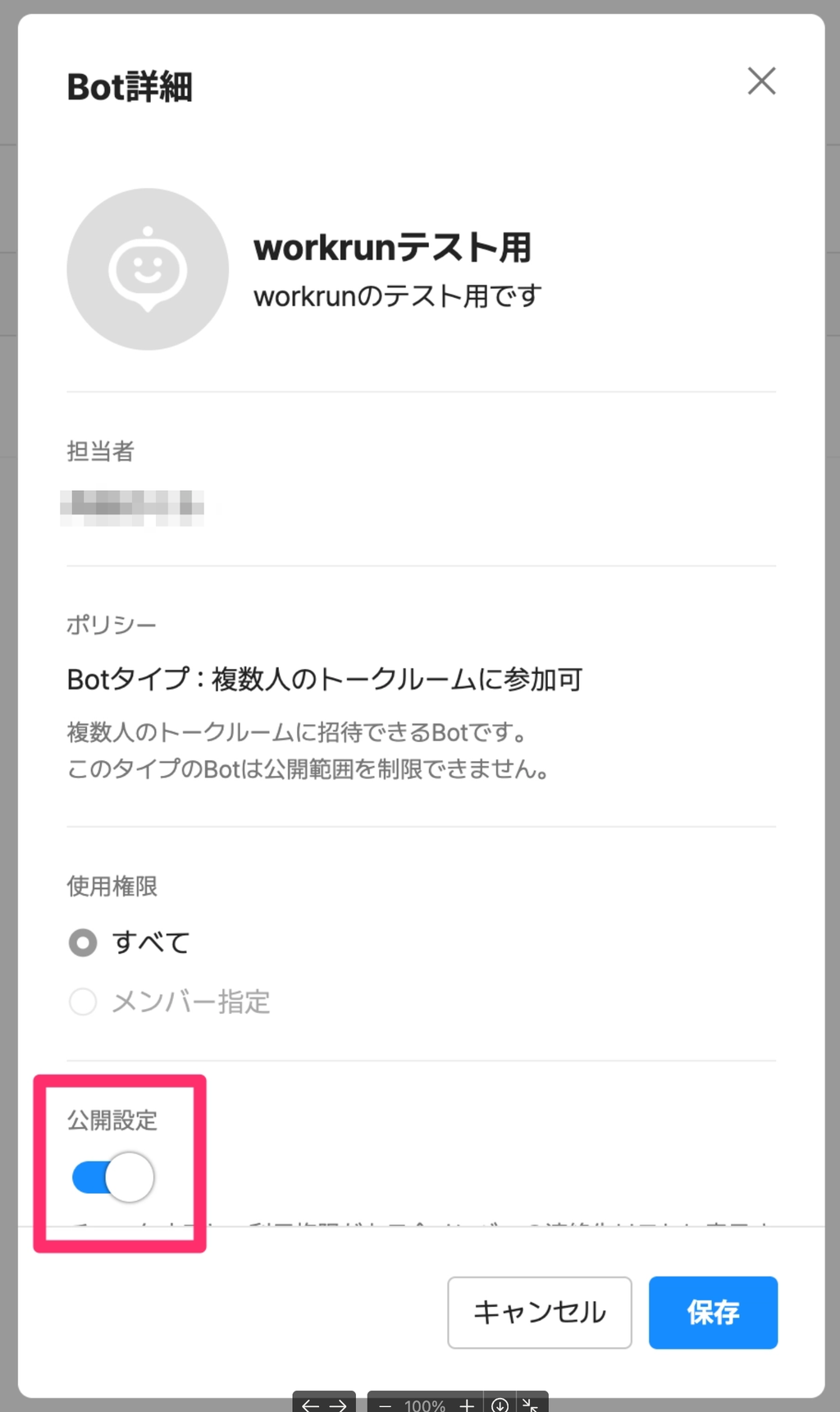 - 追加したBotをクリックして「修正」ボタンを押し公開設定を「公開」にする。このようにすることでトーク画面からもBotが見えるようになる。