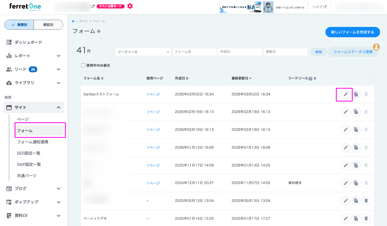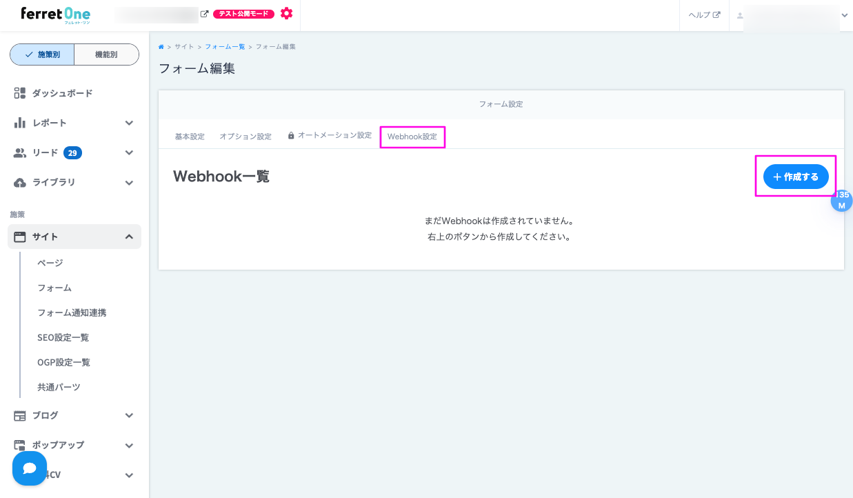Step 4:ferret Oneの管理画面より、該当フォームのWebhook設定を開き、「連携先のWebhook URL」に貼り付ける