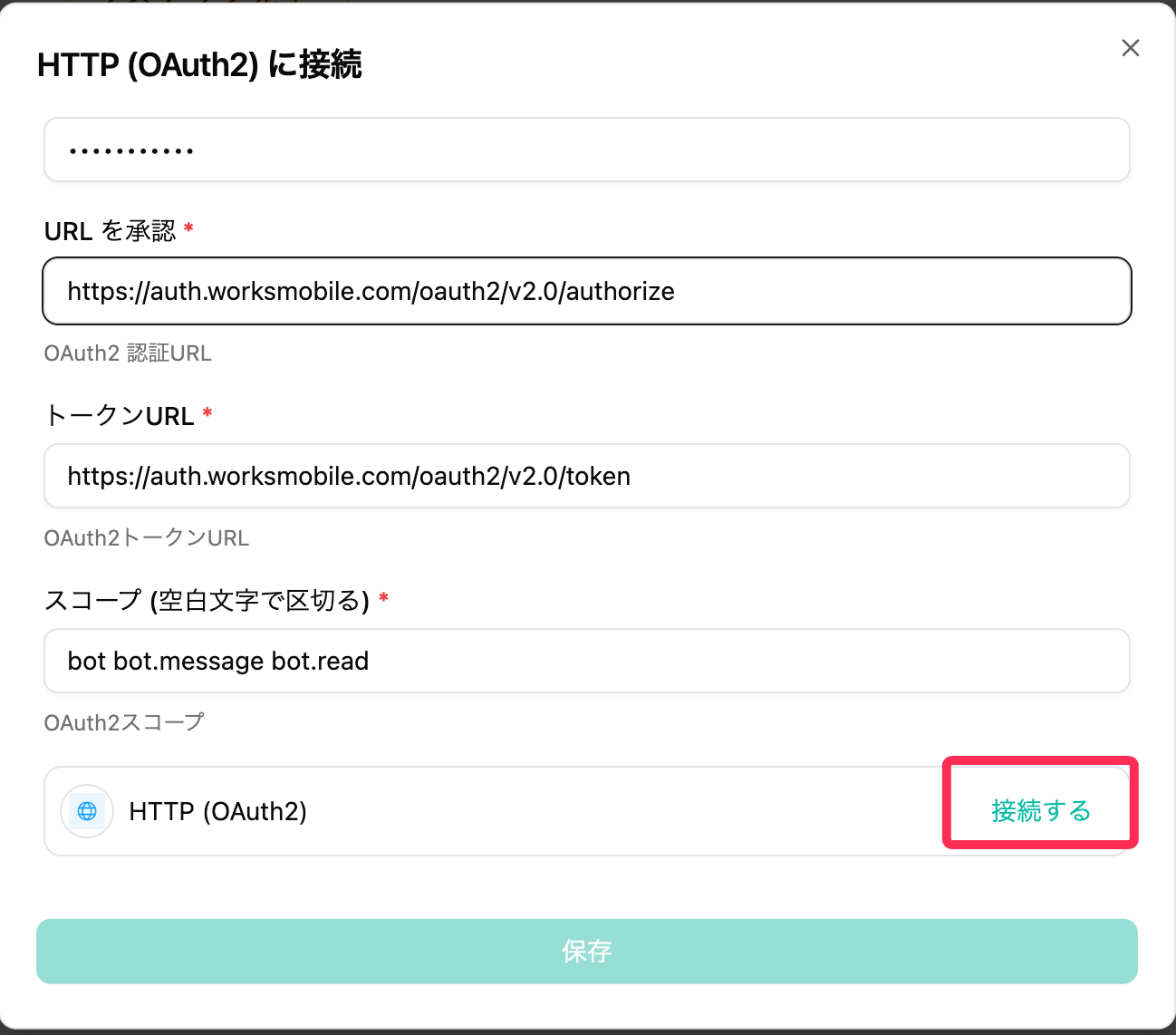 - 入力したら「接続する」を押す。問題なければ「保存」ボタンが押せるようになる。