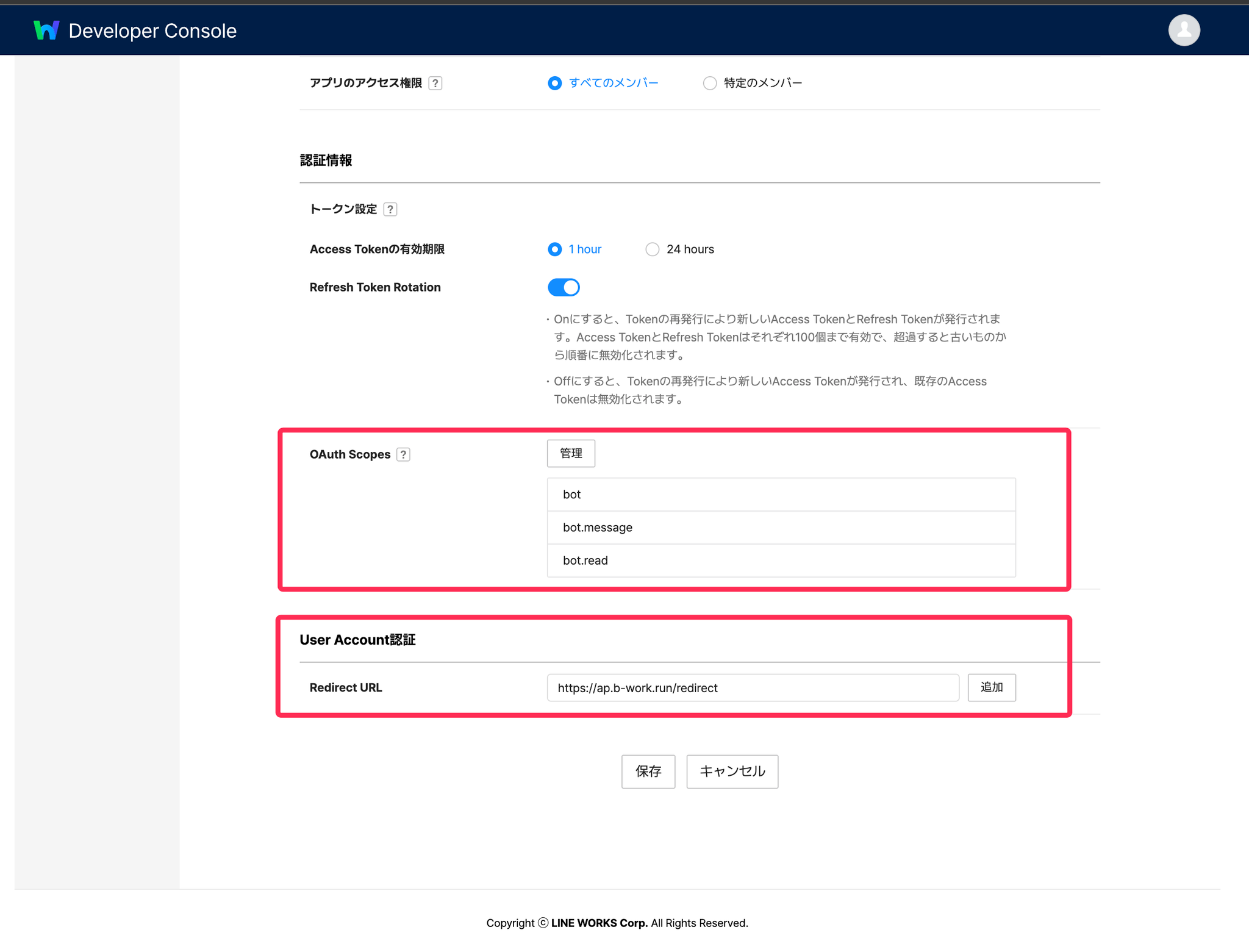 | OAuth Scopes | bot, bot.message, bot.read | https://developers.worksmobile.com/jp/docs/auth-scope |