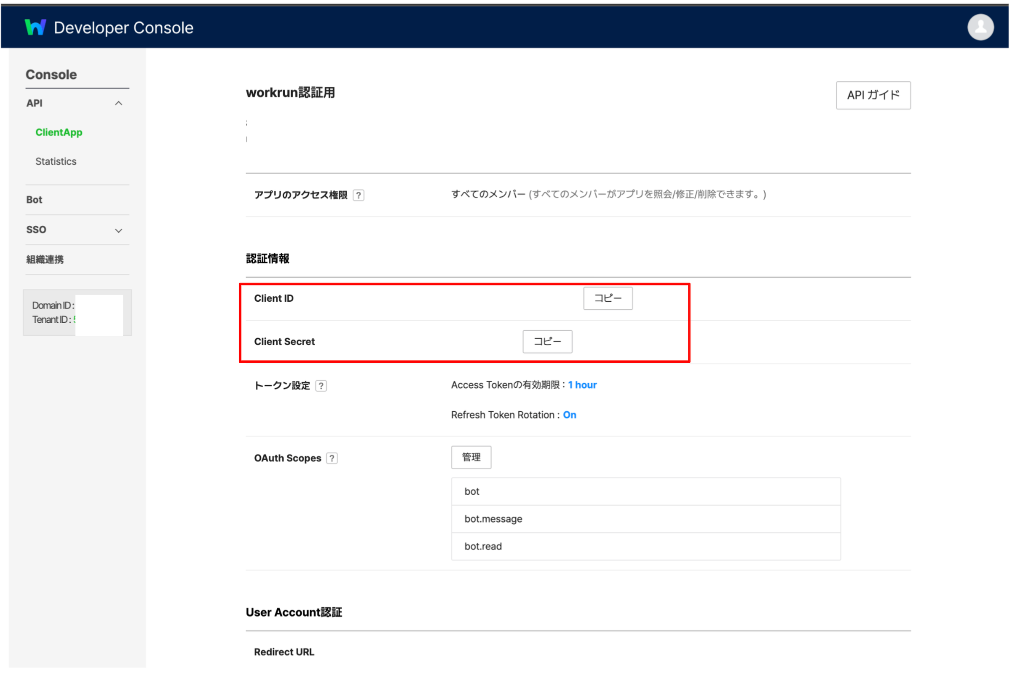 | クライアントID | https://jp2-dev.worksmobile.com/console/openapi/v2/app/list/view にアクセスし1で作成した認証アプリの設定画面に記載(添付画像参照) | |