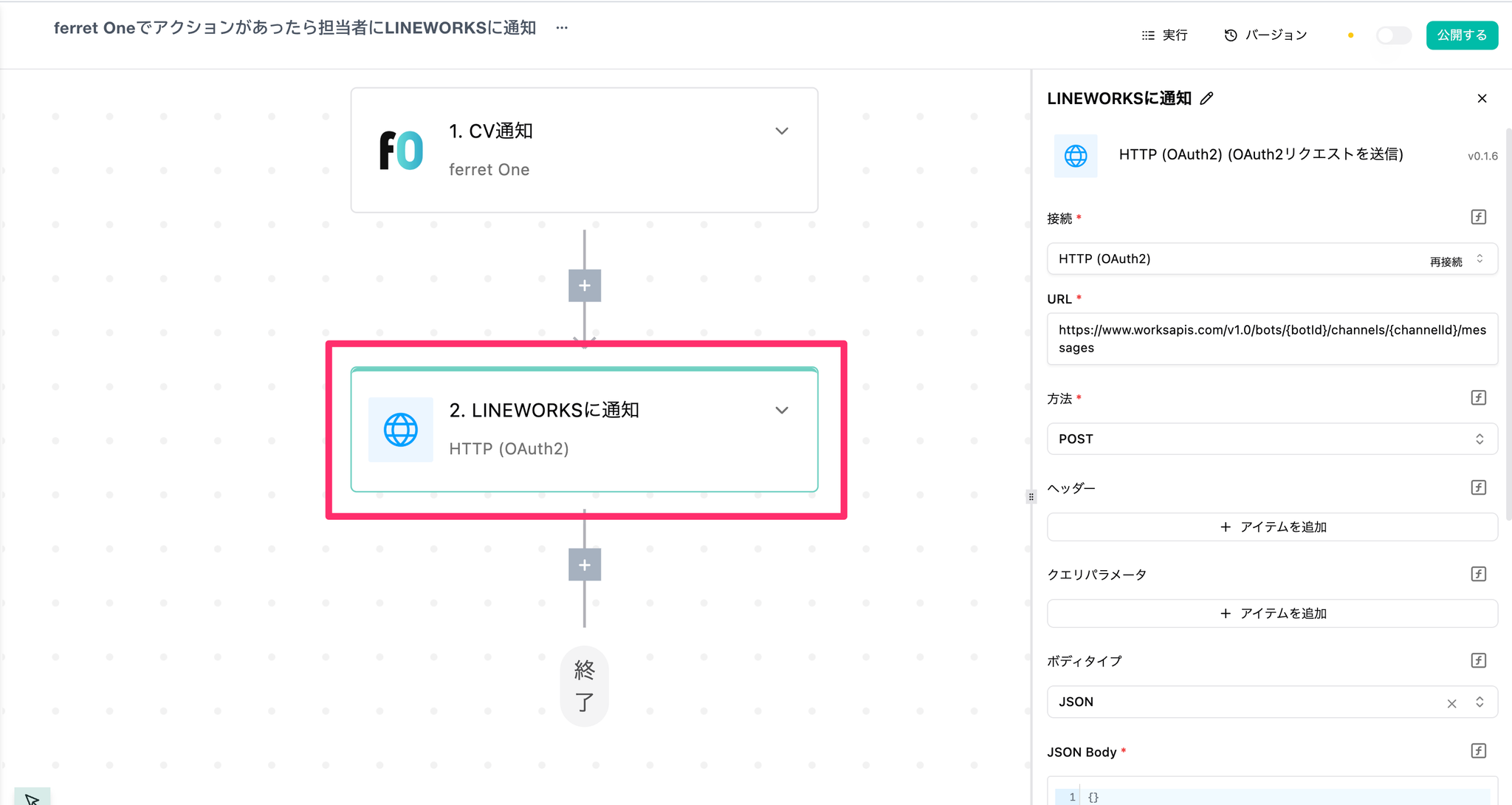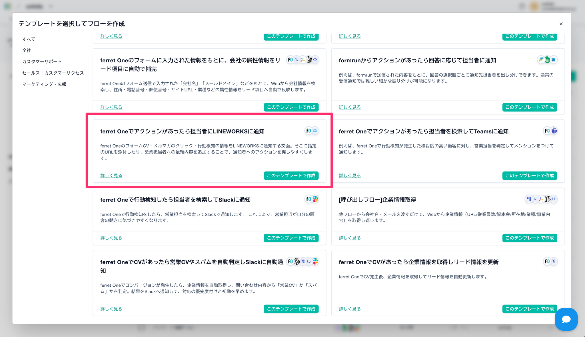 Step 2:「ferret Oneでアクションがあったら担当者にLINEWORKSに通知」を選択する