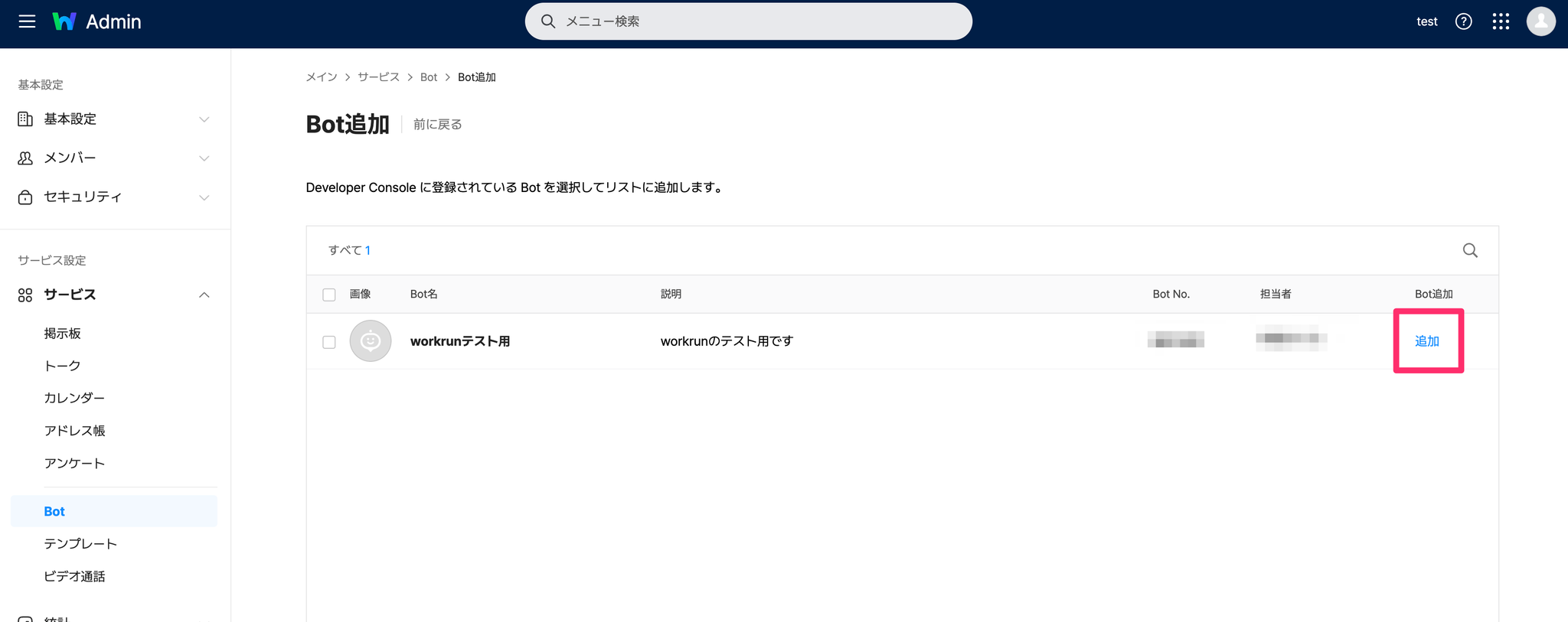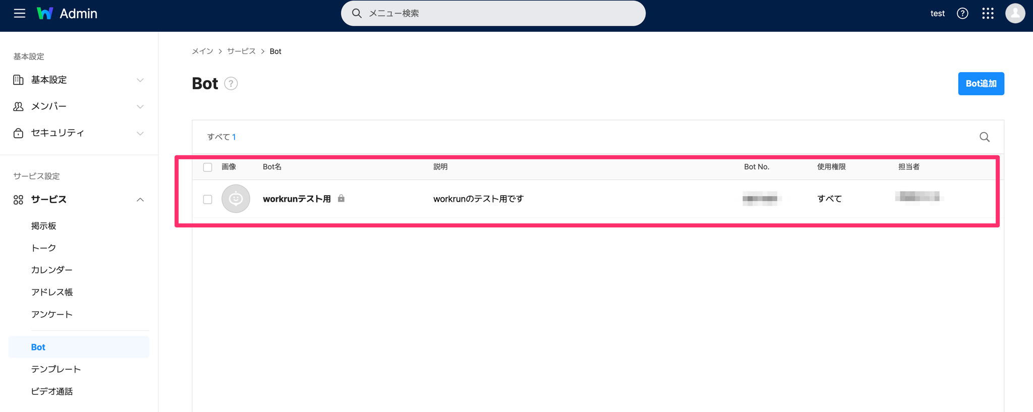 - もう一度 https://admin.worksmobile.com/service/bot にアクセスして追加したBotが存在するかを確認する。