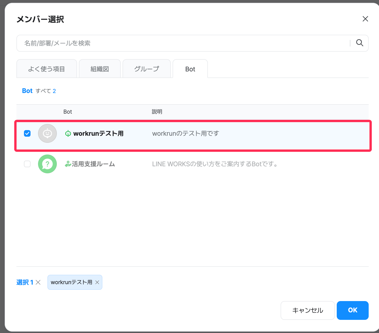 - 「新規作成」>「社内メンバーとのトーク」を押すとメンバー選択ができるのでBotから作成したBotを選択する。