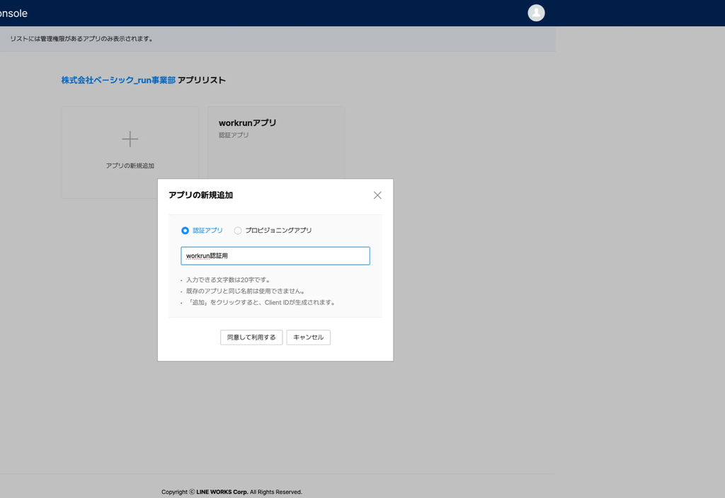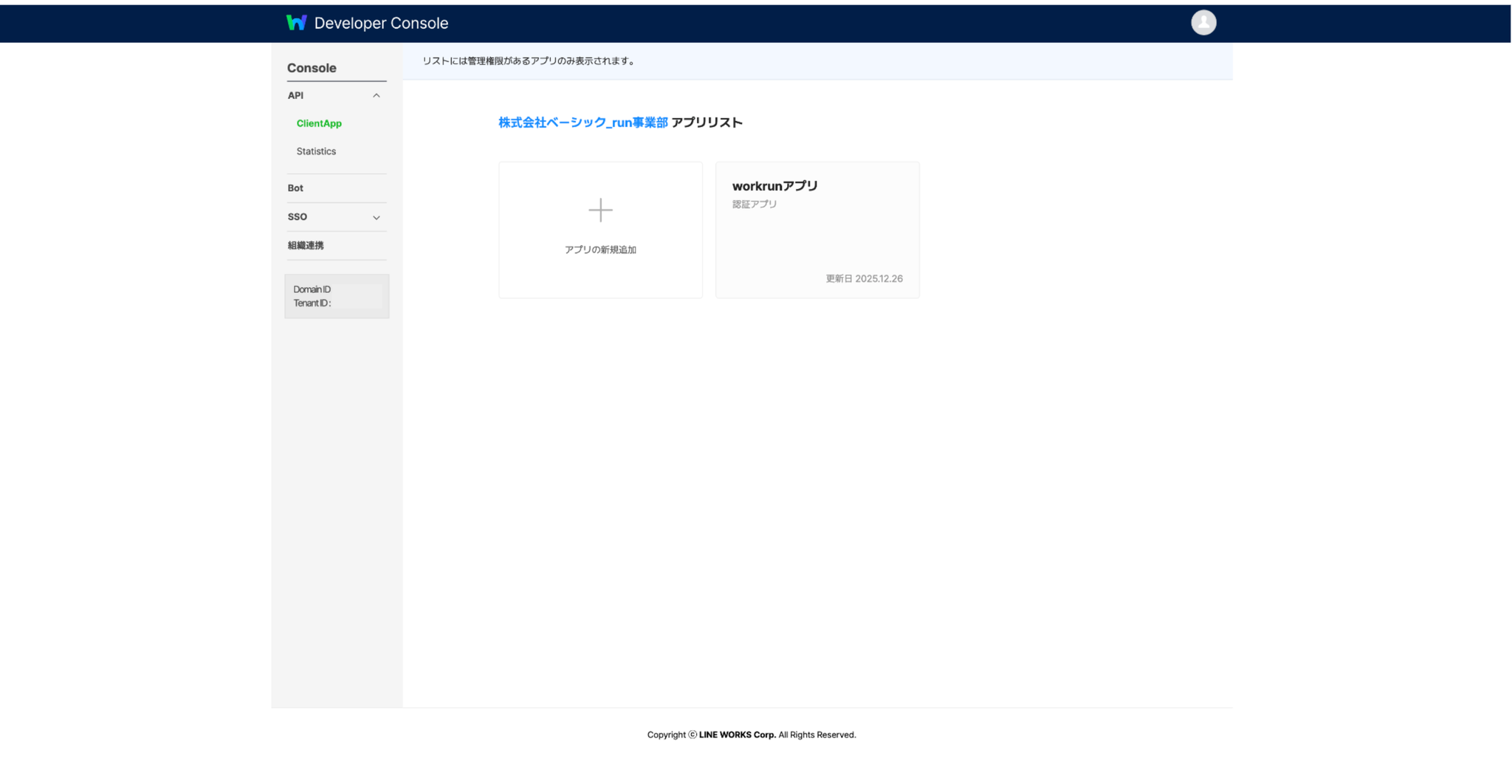 | クライアントシークレット | https://jp2-dev.worksmobile.com/console/openapi/v2/app/list/view にアクセスし1で作成した認証アプリの設定画面に記載(添付画像参照) | |