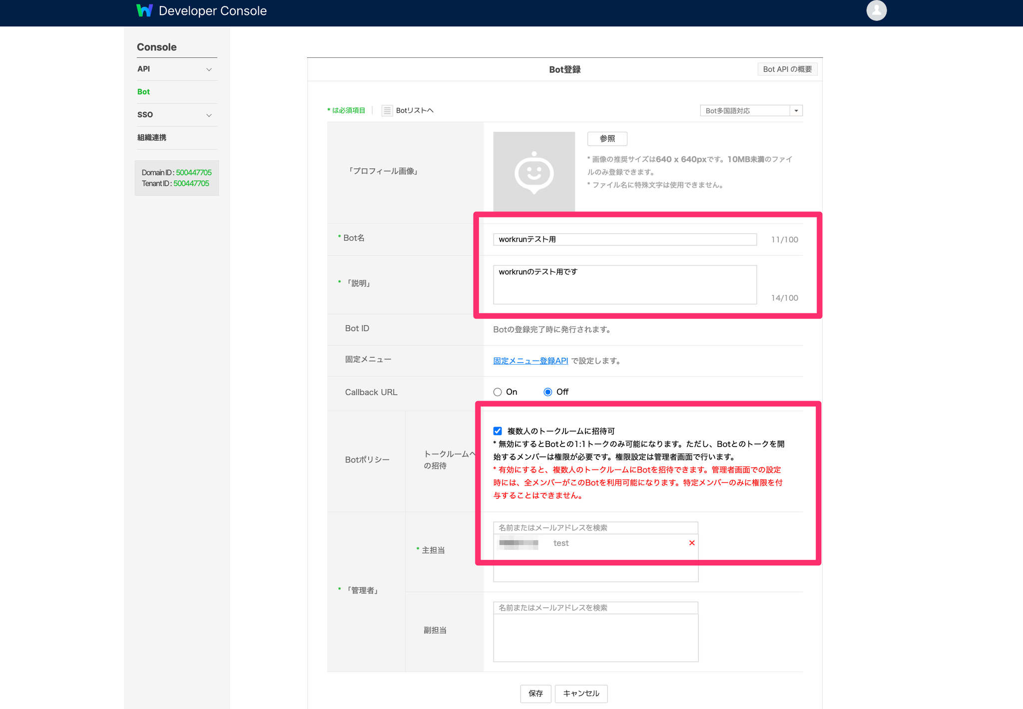 - 「登録」ボタンからBot情報登録画面を開いて、赤枠の部分を入力して保存する。