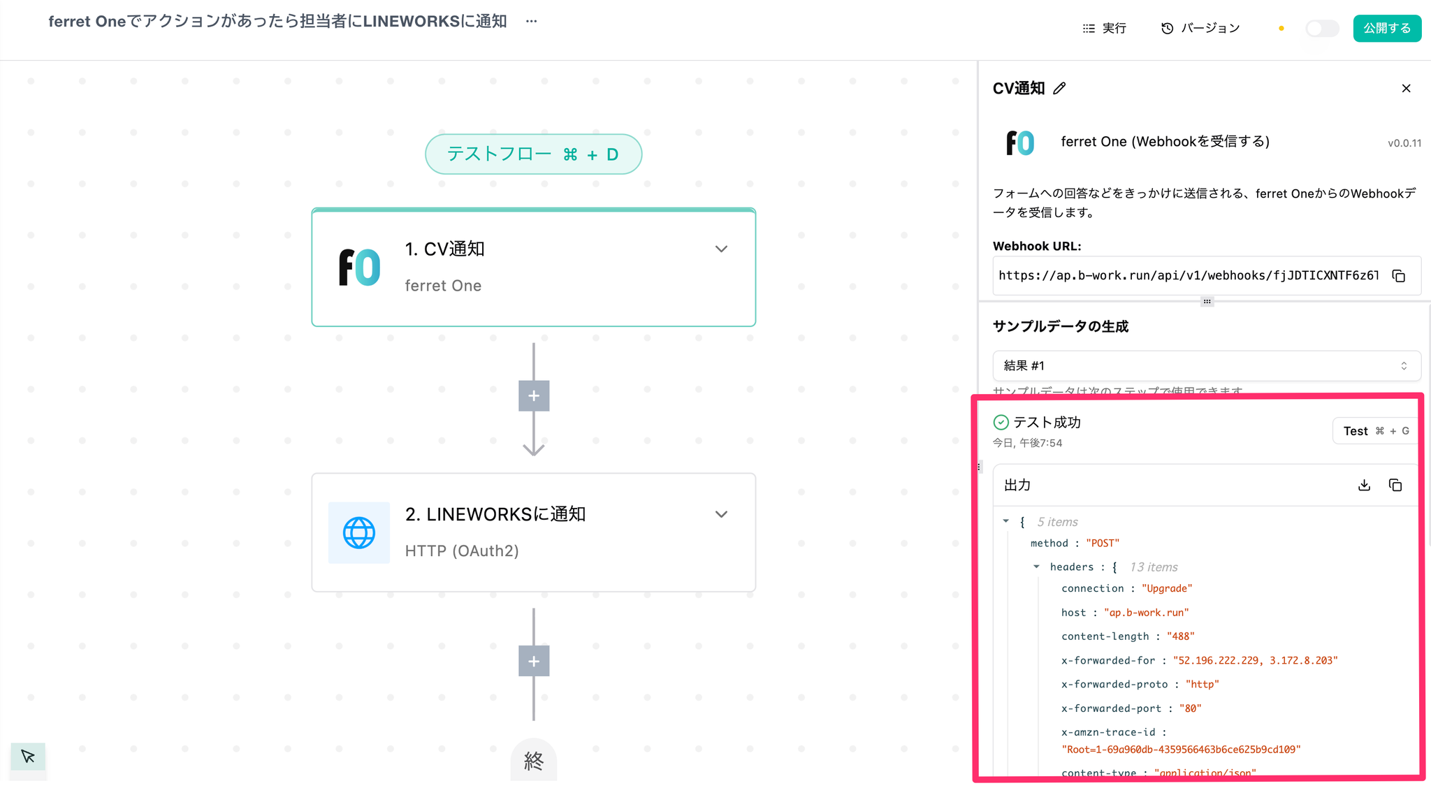 このワークフローでは、ferret Oneでのフォーム回答をトリガーとして、通知内容をカスタマイズしてLINEWORKSへ自動で連携します。