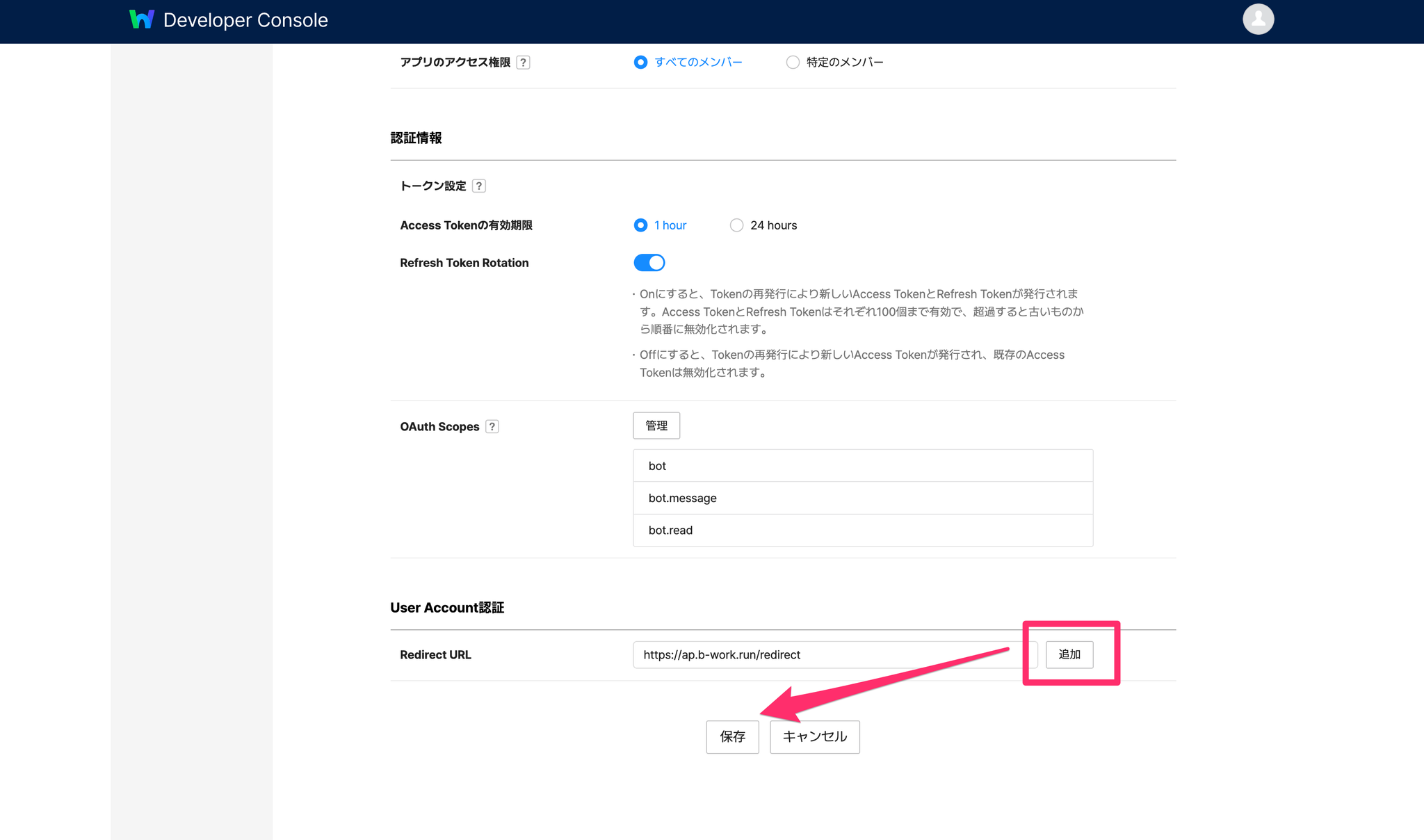 - 認証アプリの情報画面でOAuth Scopesとworkrunのredirect URLを設定して「保存」を押す。
