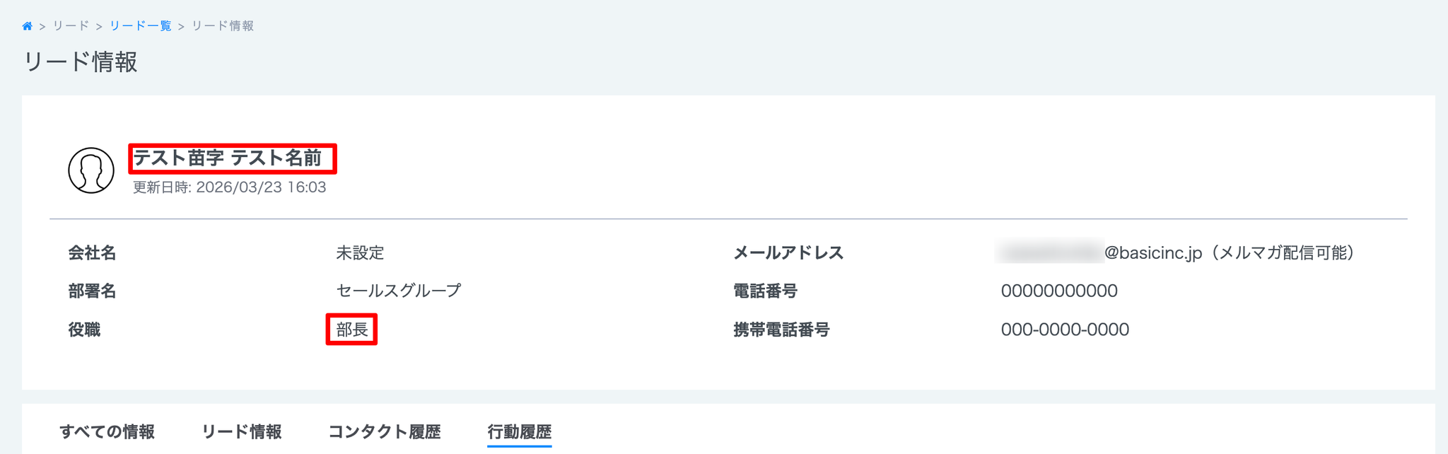 - 管理画面の「リード>リード一覧>リード情報」から、HubSpotで新規作成したテストコンタクトが新規登録、もしくは情報が更新されていたら、ワークフローの構築は成功です。